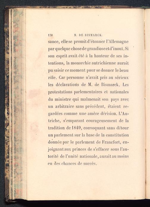 sance, elle se promit d’étonner l'Allemagne par quelque chose de grandiose etd’inouï. Sison esprit avait été à la hauteur de ses in-tentions, la monarchie autrichienne auraitpu saisir ce moment pour se donner le beaurôle. Car personne n’avait pris au sérieuxles déclarations de M. de Bismarck. Lesprotestations parlementaires et nationalesdu ministre qui malmenait son pays avecun arbitraire sans précédent, étaient re-gardées comme une amère dérision. L’Au-triche, s’emparant courageusement de latradition de 1849, convoquant sans détourun parlement sur la base de la constitutiondonnée par le parlement de Francfort, en-joignnntaux princes de s’effacer sous l’au-torité de l’unité nationale, auraitau moinseu des chances de succès.
