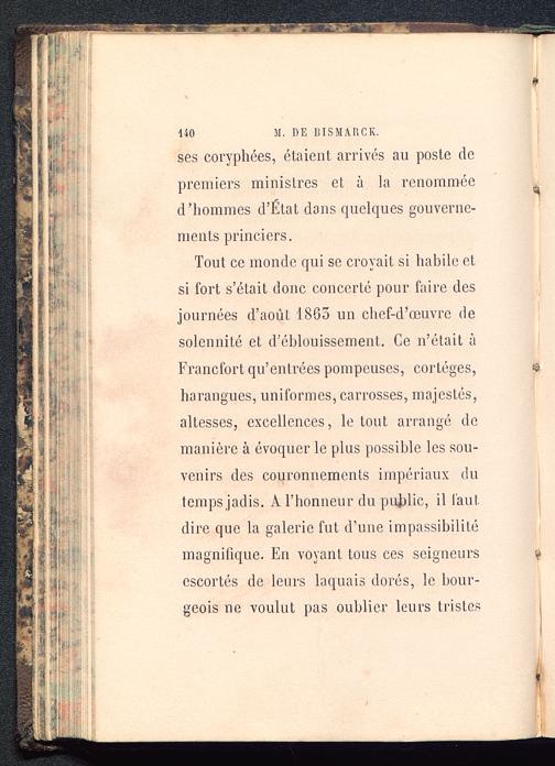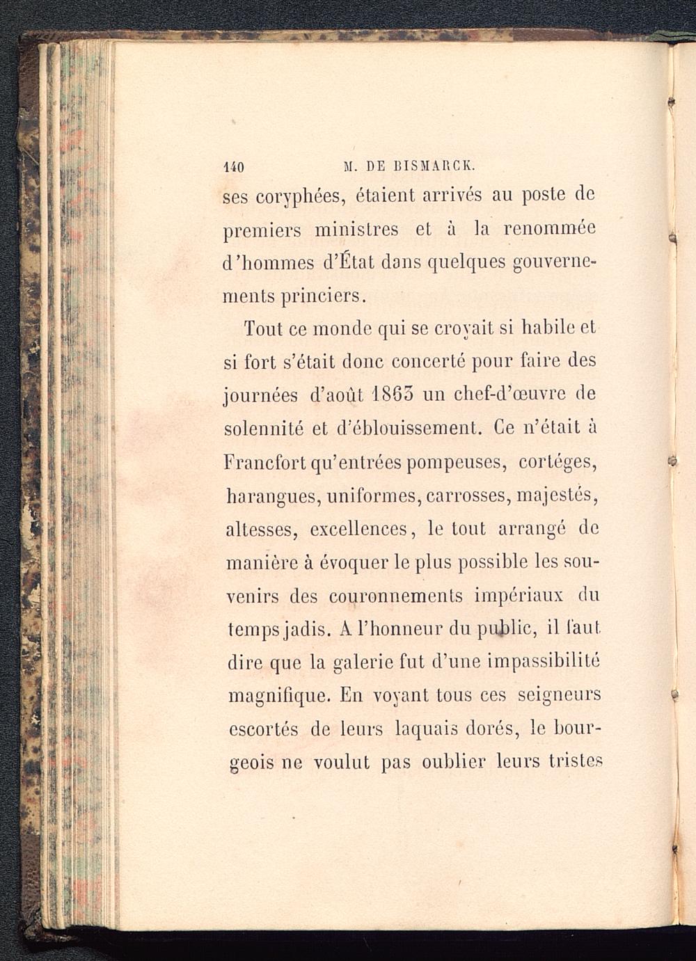 Tout ce monde qui se croyait si habile etsi fort s’était donc concerté pour faire desjournées d’aoùt 1865 un chef-d’œuvre desolennité et d’éblouissement. Ce n’était àFrancfort qu’entrées pompeuses, cortèges,harangues, uniformes, carrosses, majestés,altesses, excellences, le tout arrangé demanière à évoquer le plus possible les sou-venirs des couronnements impériaux dutempsjadis. À l’honneur du public, il fautdire que la galerie fut d’une impassibilitémagnifique. En voyant tous ces seigneursescortés de leurs laquais dorés, le bour-geois ne voulut pas oublier leurs tristes