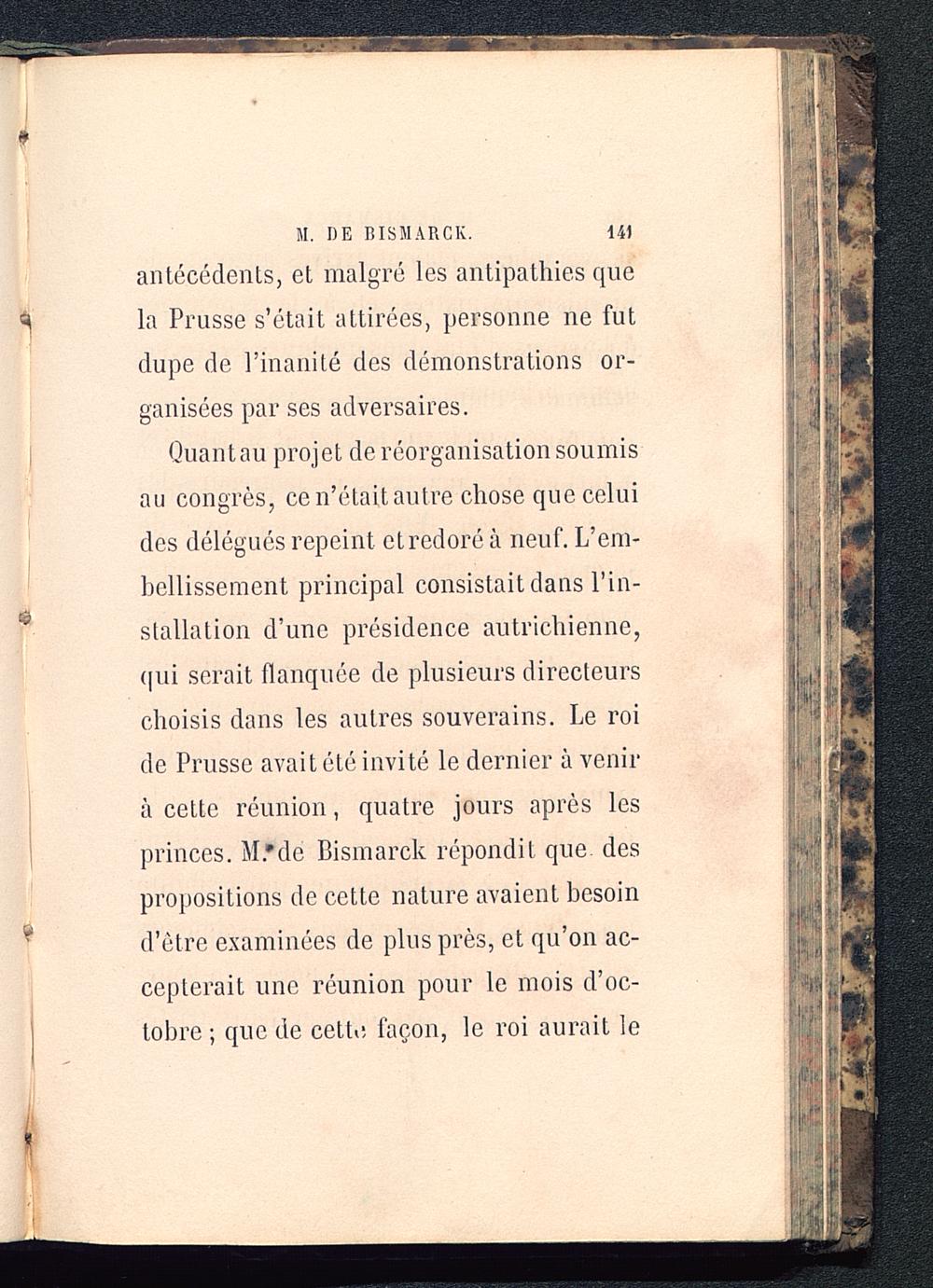 Quantau projet de réorganisation soumisau congrès, ce n’était autre chose que celuides délégués repeint et redoré à neuf. L’em-bellissement principal consistait dans l’in-stallation d’une présidence autrichienne,qui serait flanquée de plusieurs directeurschoisis dans les autres souverains. Le roide Prusse avait été invité le dernier à venirà cette réunion, quatre jours après lesprinces. M.'de Bismarck répondit que despropositions de cette nature avaient besoind’être examinées de plus près, et qu’on ac-cepterait une réunion pour le mois d’oc-tobre ; que de cette, façon, le roi aurait le