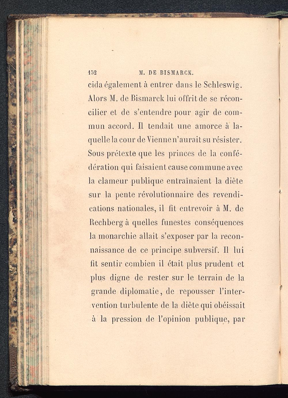 cicla également à entrer dans le Scbleswig.Alors M. de Bismarck lui offrit de se récon-cilier et de s’entendre pour agir de com-mun accord. Il tendait une amorce à la-quelle la cour de Vienne n’aurait su résister.Sous prétexte que les princes de la confé-dération qui faisaient cause commune avecla clameur publique entraînaient la diètesur la pente révolutionnaire des revendi-cations nationales, il fit entrevoir à M. deRechbergà quelles funestes conséquencesla monarchie allait s’exposer par la recon-naissance de ce principe subversif. Il luilit sentir combien il était plus prudent etplus digne de rester sur le terrain de lagrande diplomatie, de repousser l’inter-vention turbulente de la diète cjui obéissaità la pression de l’opinion publique, par