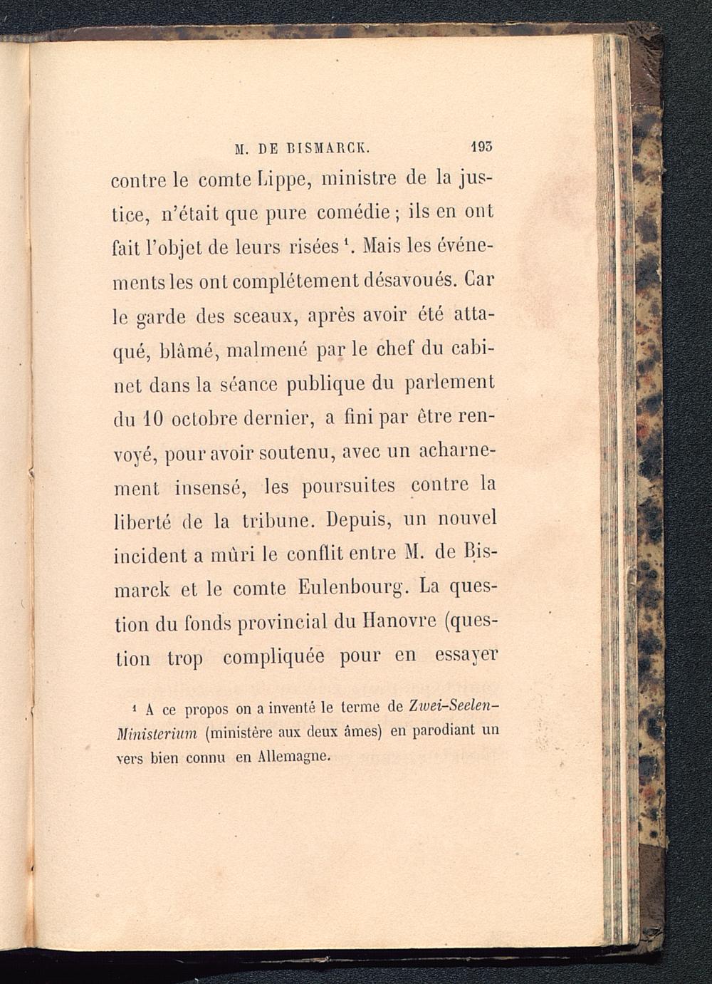 contre le comte Lippe, ministre de la jus-tice, n’était que pure comédie; ils en ontfait l’objet de leurs risées *. Mais les événe-ments les ont complètement désavoués. Carle garde des sceaux, après avoir été atta-qué, blâmé, malmené par le chef du cabi-net dans la séance publique du parlementdu 10 octobre dernier, a fini par être ren-voyé, pour avoir soutenu, avec un acharne-ment insensé, les poursuites contre laliberté de la tribune. Depuis, un nouvelincident a mûri le conflit entre M. de Bis-marck et le comte Eulenbourg. La ques-tion du fonds provincial du Hanovre (ques-tion trop compliquée pour en essayer