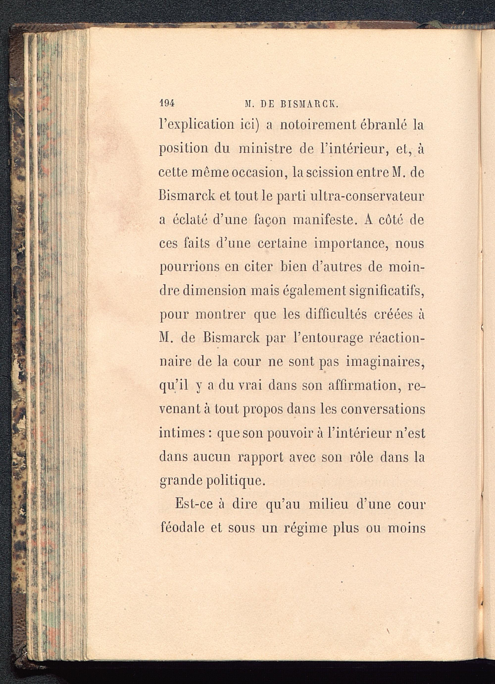 l’explication ici) a notoirement ébranlé laposition du ministre de l’intérieur, et, àcette même occasion, la scission entre M. deBismarck et tout le parti ultra-conservateura éclaté d’une façon manifeste. À côté deces faits d’une certaine importance, nouspourrions en citer bien d’autres de moin-dre dimension mais également significatifs,pour montrer que les difficultés créées àM. de Bismarck par l’entourage réaction-naire de la cour ne sont pas imaginaires,qu’il y a du vrai dans son affirmation, re-venant à tout propos dans les conversationsintimes : que son pouvoir à l’intérieur n’estdans aucun rapport avec son rôle dans lagrande politique.
