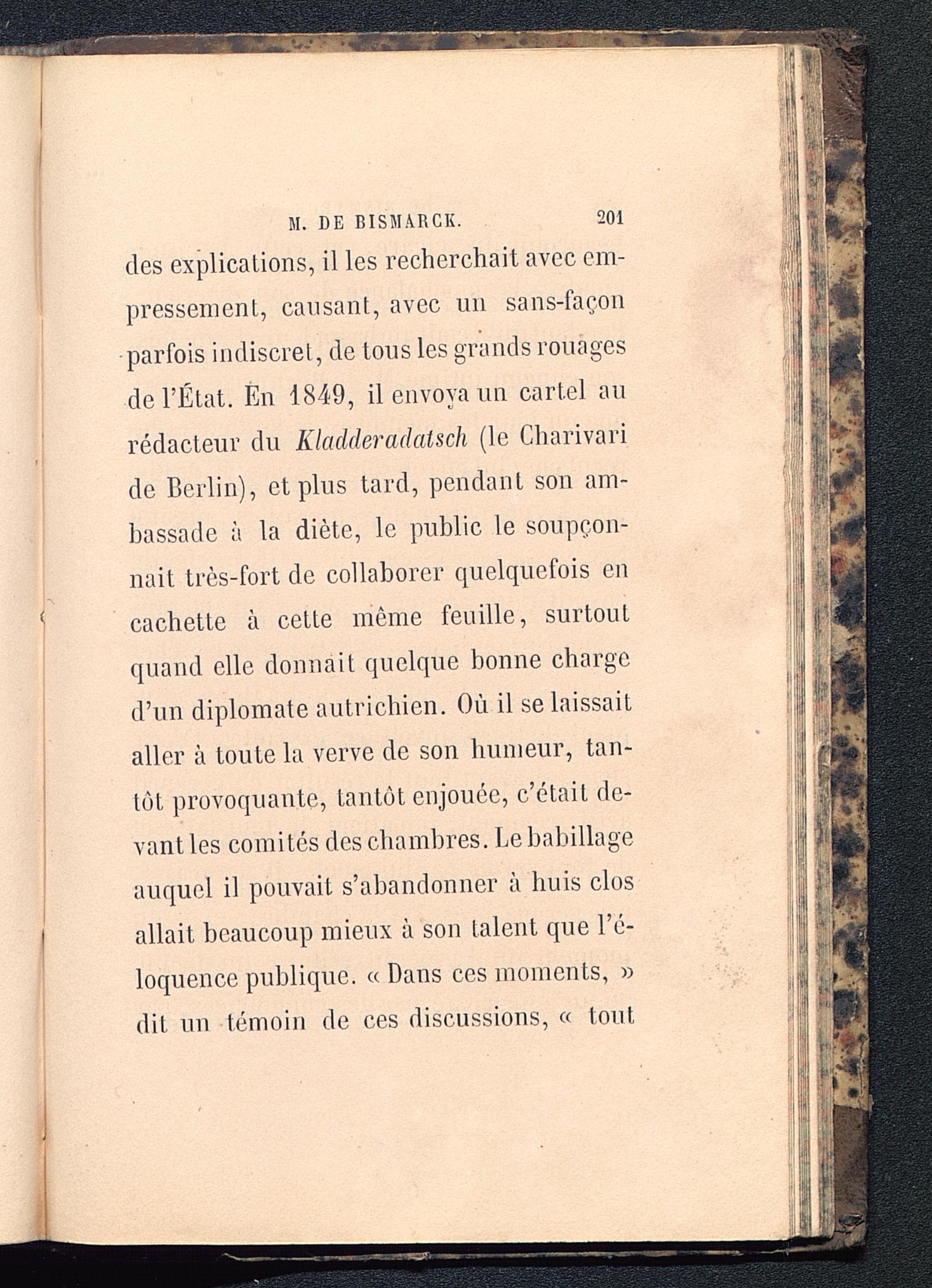 des explications, il les recherchait avec em-pressement, causant, avec un sans-façonparfois indiscret, de tous les grands rouagesde l’État. En 1849, il envoya un cartel aurédacteur du Kladderadalsch (le Charivaride Berlin), et plus tard, pendant son am-bassade à la diète, le public le soupçon-nait très-fort de collaborer quelquefois encachette à cette même feuille, surtoutquand elle donnait quelque bonne charged’un diplomate autrichien. Où il se laissaitaller à toute la verve de son humeur, tan-tôt provoquante, tantôt enjouée, c’était de-vant les comités des chambres. Le babillageauquel il pouvait s’abandonner à huis closallait beaucoup mieux à son talent que l’é-loquence publique. « Dans ces moments, »dit un témoin de ces discussions, ce tout