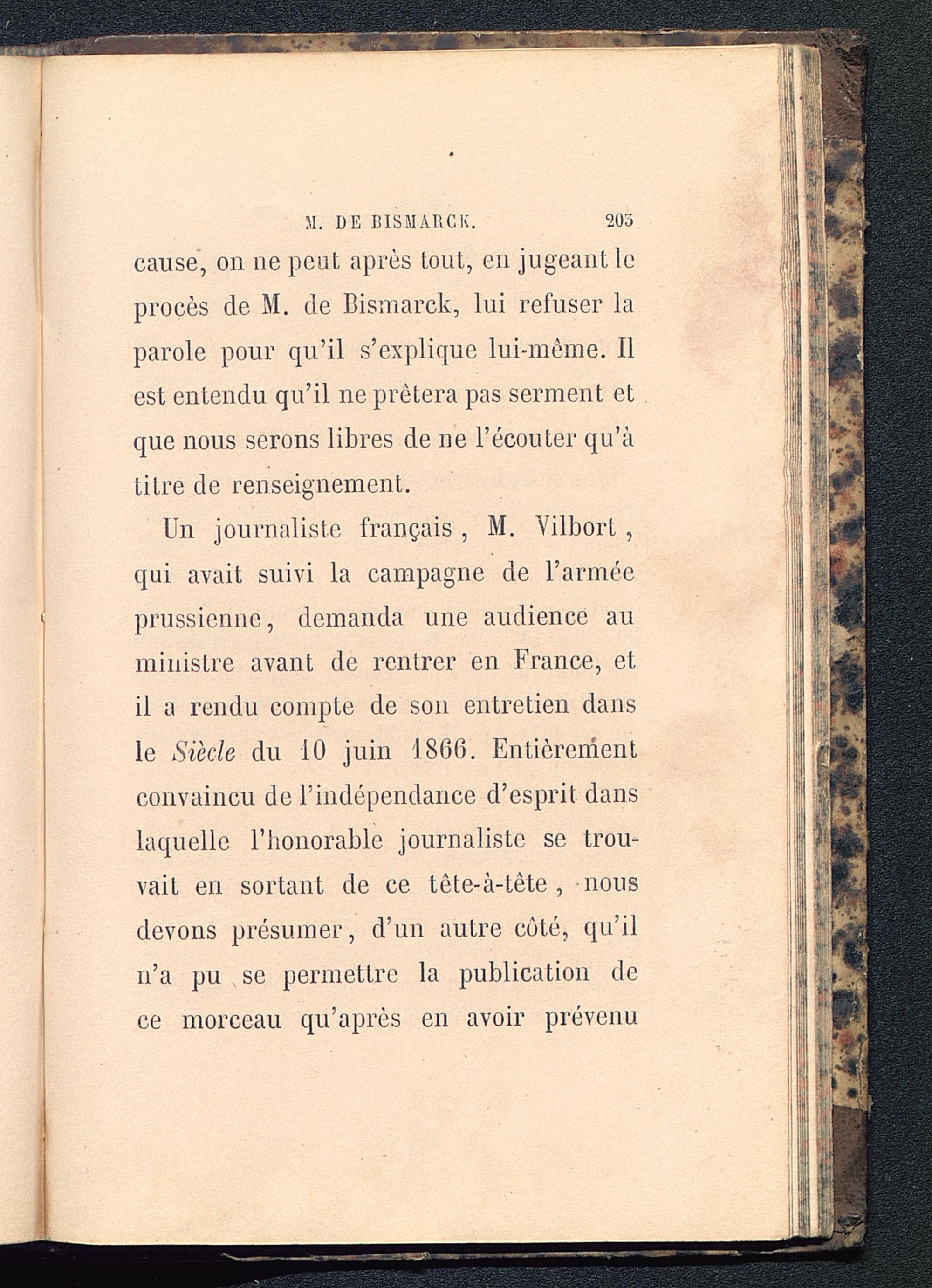 Un journaliste français , M. Vilbort,qui avait suivi la campagne de l’arméeprussienne, demanda une audience auministre avant de rentrer en France , etil a rendu compLe de son entretien dansle Siècle du 10 juin 1866. Entièrementconvaincu de l’indépendance d’esprit danslaquelle l’honorable journaliste se trou-vait en sortant de ce tête-à-tête, nousdevons présumer, d’un autre côté, qu’iln’a pu se permettre la publication dece morceau qu’après en avoir prévenu