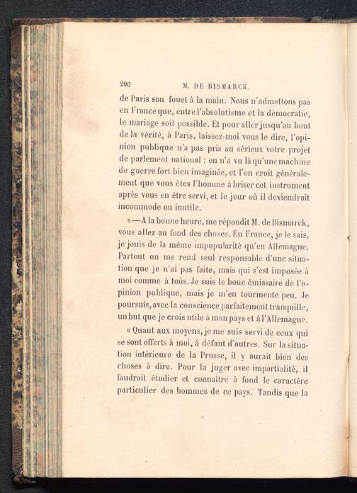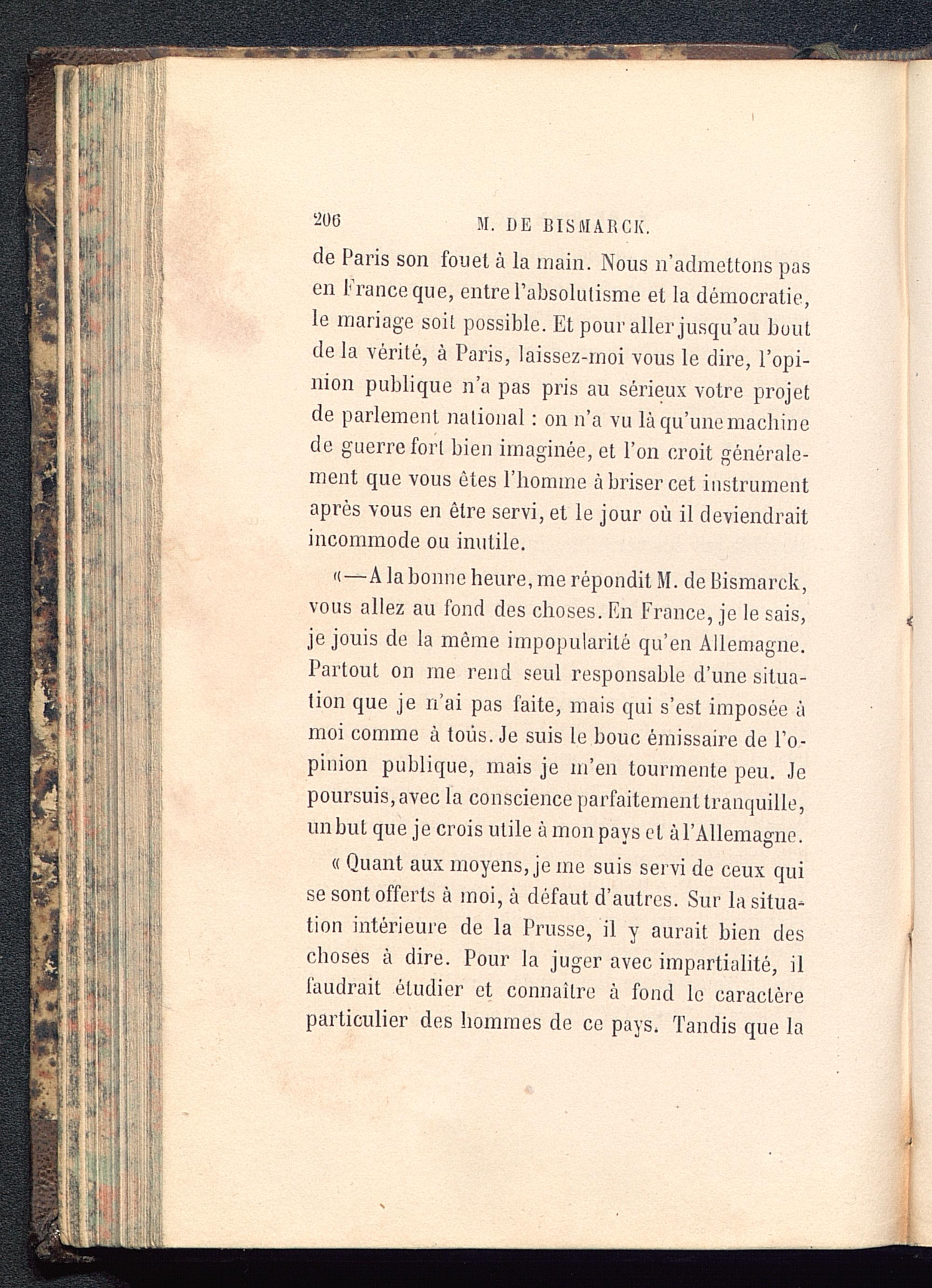 de Paris son fouet à la main. Nous n’admettons pasen France que, entre l'absolutisme et la démocratie,le mariage soit possible. Et pour aller jusqu’au boutde la vérité, à Paris , laissez-moi vous le dire, l’opi-nion publique n’a pas pris au sérieux votre projetde parlement national : on n’a vu là qu’une machinede guerre fort bien imaginée, et l’on croit générale-ment que vous êtes l’homme à briser cet instrumentaprès vous en être servi, et le jour où il deviendraitincommode ou inutile.