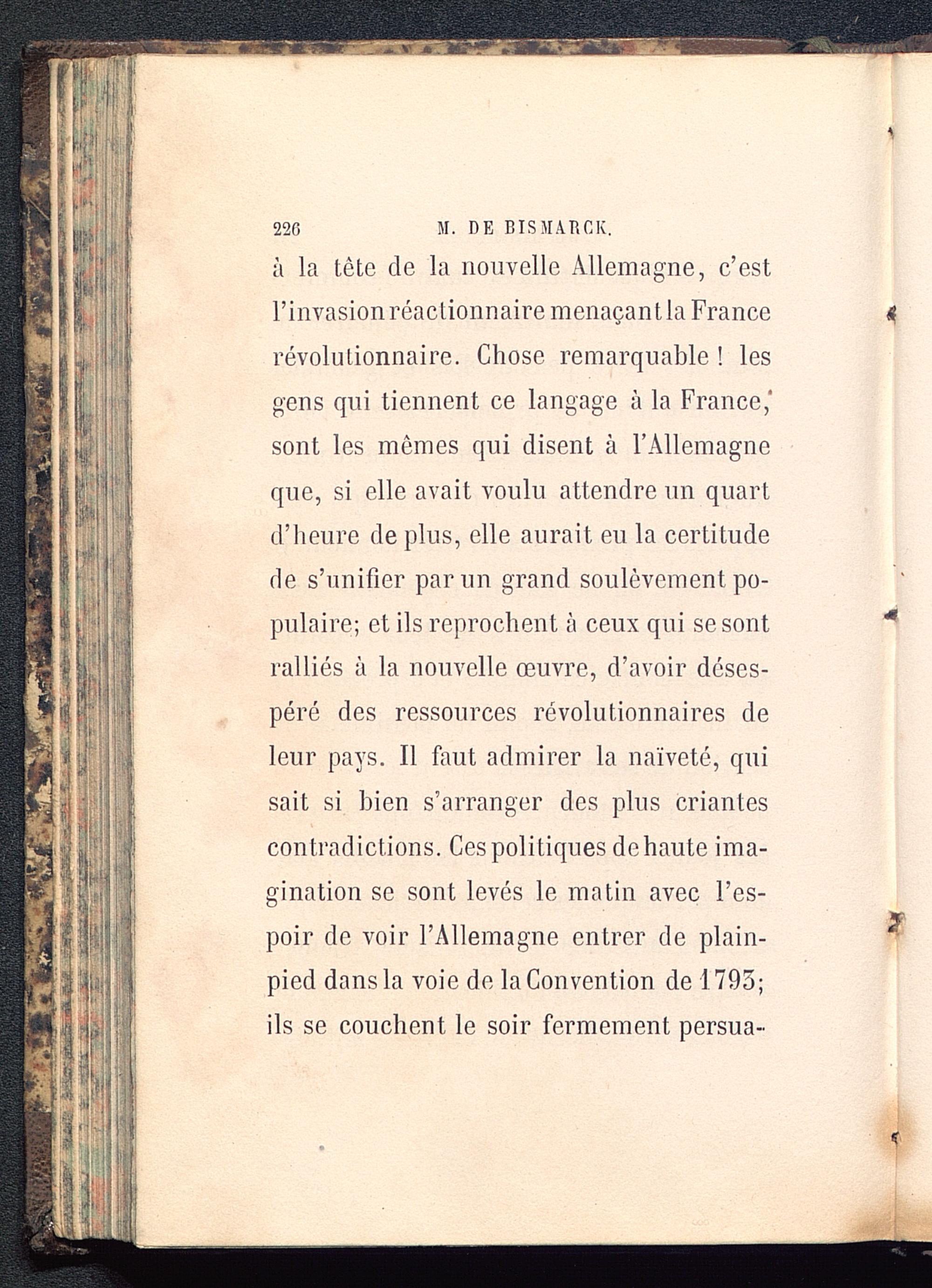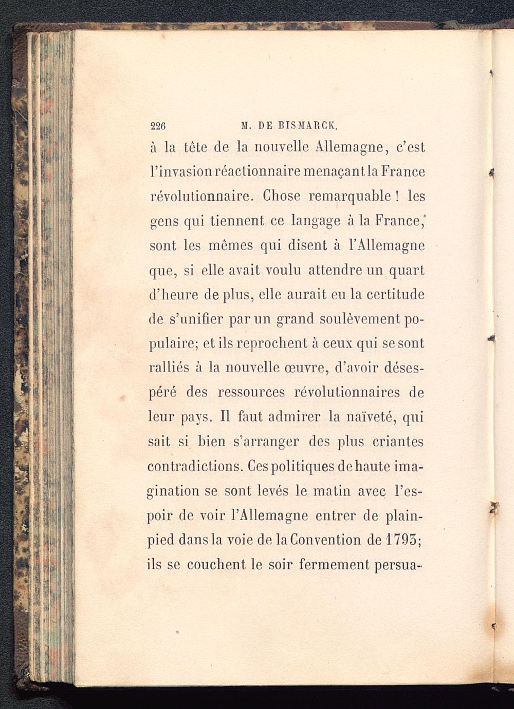 à la tête de la nouvelle Allemagne , c’estPinvasionréaclionnairemenaçantia Francerévolutionnaire. Chose remarquable ! lesgens qui tiennent ce langage à la France, 'sont les mêmes qui disent à l’Allemagne que, si elle avait voulu attendre un quartd’heure de plus, elle aurait eu la certitudede s’unifier par un grand soulèvement po-pulaire; et ils reprochent à ceux qui se sontralliés à la nouvelle œuvre, d’avoir déses-péré des ressources révolutionnaires deleur pays. Il fout admirer la naïveté, quisait si bien s’arranger des plus criantescontradictions. Ces politiques de haute ima-gination se sont levés le matin avec l’es-poir de voir l’Allemagne entrer de plain-pied dans la voie de la Convention de 1795;ils se couchent le soir fermement persua-