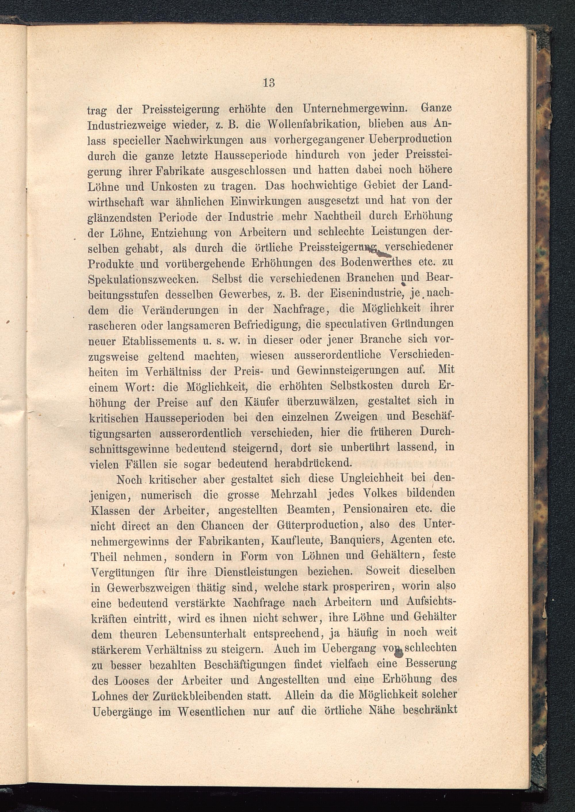 trag der Preissteigerung erhöhte den Unternehmergewinn. GanzeIndustriezweige wieder, z. B. die Wollenfabrikation, blieben aus An-lass specieller Nachwirkungen aus vorhergegangener Ueberproductiondurch die ganze letzte Hausseperiode hindurch von jeder Preisstei-gerung ihrer Fabrikate ausgeschlossen und hatten dabei noch höhereLöhne und Unkosten zu tragen. Das hochwichtige Gebiet der Land-wirthschaft war ähnlichen Einwirkungen ausgesetzt und hat von derglänzendsten Periode der Industrie mehr Nachtheil durch Erhöhungder Löhne, Entziehung von Arbeitern und schlechte Leistungen der-selben gehabt, als durch die örtliche Preissteigerm ^ve rschiedenerProdukte und vorübergehende Erhöhungen des Bodenwerthes etc. zuSpekulationszwecken. Selbst die verschiedenen Branchen und Bear-beitungsstufen desselben Gewerbes, z. B. der Eisenindustrie, je.nach-dem die Veränderungen in der Nachfrage, die Möglichkeit ihrerrascheren oder langsameren Befriedigung, die speculativen Gründungenneuer Etablissements u. s. w. in dieser oder jener Branche sich vor-zugsweise geltend machten, wiesen ausserordentliche Verschieden-heiten im Verhältniss der Preis- und Gewinnsteigerungen auf. Miteinem Wort: die Möglichkeit, die erhöhten Selbstkosten durch Er-höhung der Preise auf den Käufer überzuwälzen, gestaltet sich inkritischen Hausseperioden bei den einzelnen Zweigen und Beschäf-tigungsarten ausserordentlich verschieden, hier die früheren Durch-schnittsgewinne bedeutend steigernd, dort sie unberührt lassend, invielen Fällen sie sogar bedeutend herabdrückend.