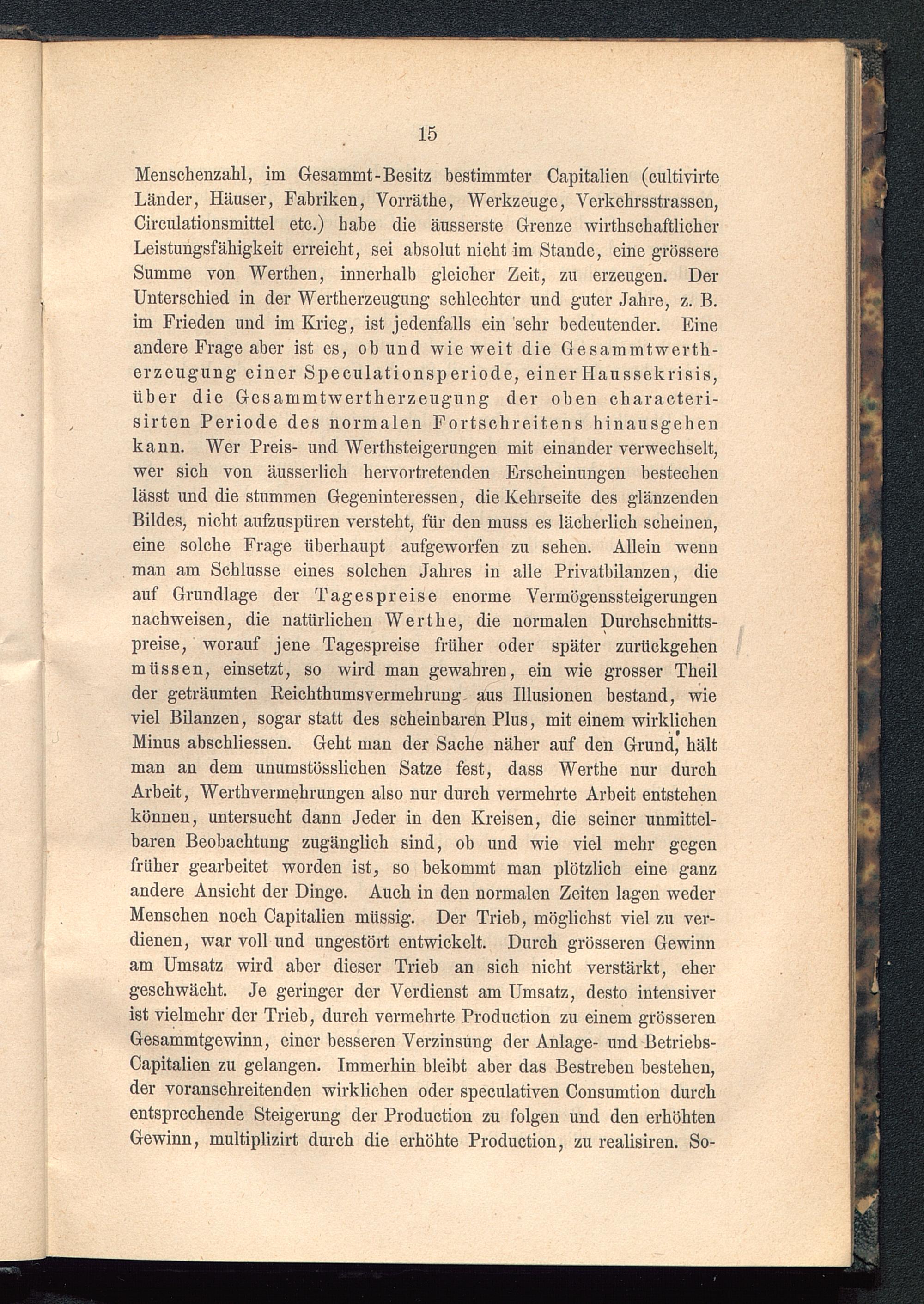 Menschenzahl, im Gesammt-Besitz bestimmter Capitalien (cultivirteLänder, Häuser, Fabriken, Vorräthe, Werkzeuge, Verkehrsstrassen,Circulationsmittel etc.) habe die äusserste Grenze wirtschaftlicherLeistungsfähigkeit erreicht, sei absolut nicht im Stande, eine grössereSumme von Werthen, innerhalb gleicher Zeit, zu erzeugen. DerUnterschied in der Wertherzeugung schlechter und guter Jahre, z. B.im Frieden und im Krieg, ist jedenfalls ein sehr bedeutender. Eineandere Frage aber ist es, ob und wieweit die Gesammtwertk-erzeugung einer Speculationsperiode, einer Haussekrisis,über die Gesammtwertkerzeugung der oben ckaracteri-sirten Periode des normalen Fortsckreitens hinausgehenkann. Wer Preis- und Werthsteigerungen mit einander verwechselt,wer sich von äusserlick hervortretenden Erscheinungen bestechenlässt und die stummen Gegeninteressen, die Kehrseite des glänzendenBildes, nicht aufzuspüren versteht, für den muss es lächerlich scheinen,eine solche Frage überhaupt aufgeworfen zu sehen. Allein wennman am Schlüsse eines solchen Jahres in alle Privatbilanzen, dieauf Grundlage der Tagespreise enorme Vermögenssteigerungennachweisen, die natürlichen Wertlie, die normalen Durchschnitts-preise, worauf jene Tagespreise früher oder später zurtickgehenmüssen, einsetzt, so wird man gewahren, ein wie grosser Theilder geträumten Reichthums Vermehrung aus Illusionen bestand, wieviel Bilanzen, sogar statt des scheinbaren Plus, mit einem wirklichenMinus abschliessen. Geht man der Sache näher auf den Grund, hältman an dem unumstösslichen Satze fest, dass Werthe nur durchArbeit, Werth Vermehrungen also nur durch vermehrte Arbeit entstehenkönnen, untersucht dann Jeder in den Kreisen, die seiner unmittel-baren Beobachtung zugänglich sind, ob und wie viel mehr gegenfrüher gearbeitet worden ist, so bekommt man plötzlich eine ganzandere Ansicht der Dinge. Auch in den normalen Zeiten lagen wederMenschen noch Capitalien müssig. Der Trieb, möglichst viel zu ver-dienen, war voll und ungestört entwickelt. Durch grösseren Gewinnam Umsatz wird aber dieser Trieb an sich nicht verstärkt, ehergeschwächt. Je geringer der Verdienst am Umsatz, desto intensiverist vielmehr der Trieb, durch vermehrte Production zu einem grösserenGesammtgewinn, einer besseren Verzinsung der Anlage- und Betriebs-Capitalien zu gelangen. Immerhin bleibt aber das Bestreben bestehen,der voranschreitenden wirklichen oder speculativen Consumtion durchentsprechende Steigerung der Production zu folgen und den erhöhtenGewinn, multiplizirt durch die erhöhte Production, zu realisiren. So-