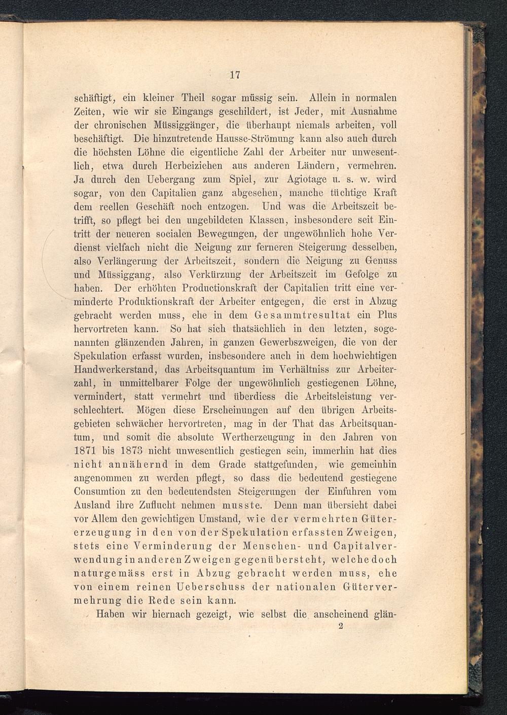 schäftigt, ein kleiner Tlieil sogar müssig sein. Allein in normalenZeiten, wie wir sie Eingangs geschildert, ist Jeder, mit Ausnahmeder chronischen Müssiggänger, die überhaupt niemals arbeiten, vollbeschäftigt. Die hinzutretende Hausse-Strömung kann also auch durchdie höchsten Löhne die eigentliche Zahl der Arbeiter nur unwesent-lich, etwa durch Herbeiziehen aus anderen Ländern, vermehren.Ja durch den Uehergang zum Spiel, zur Agiotage u. s. w. wirdsogar, von den Capitalien ganz abgesehen, manche tüchtige Kraftdem reellen Geschäft noch entzogen. Und was die Arbeitszeit be-trifft, so pflegt hei den ungebildeten Klassen, insbesondere seit Ein-tritt der neueren socialen Bewegungen, der ungewöhnlich hohe Ver-dienst vielfach nicht die Neigung zur ferneren Steigerung desselben,also Verlängerung der Arbeitszeit, sondern die Neigung zu Genussund Müssiggang , also Verkürzung der Arbeitszeit im Gefolge zuhaben. Der erhöhten Productionskraft der Capitalien tritt eine ver-minderte Produktionskraft der Arbeiter entgegen, die erst in Abzuggebracht werden muss, ehe in dem Ge sammtresultat ein Plushervortreten kann. So hat sich thatsächlich in den letzten, soge-nannten glänzenden Jahren, in ganzen Gewerbszweigen, die von derSpekulation erfasst wurden, insbesondere auch in dem hochwichtigenHandwerkerstand, das Arbeitsquantum im Verhältniss zur Arbeiter-zahl, in unmittelbarer Folge der ungewöhnlich gestiegenen Löhne,vermindert, statt vermehrt und überdiess die Arbeitsleistung ver-schlechtert. Mögen diese Erscheinungen auf den übrigen Arbeits-gebieten schwächer hervortreten, mag in der That das Arbeitsquan-tum, und somit die absolute Wertherzeugung in den Jahren von1871 bis 1873 nicht unwesentlich gestiegen sein, immerhin hat diesnicht annähernd in dem Grade stattgefunden, wie gemeinhinangenommen zu werden pflegt, so dass die bedeutend gestiegeneConsumtion zu den bedeutendsten Steigerungen der Einfuhren vomAusland ihre Zuflucht nehmen musste. Denn man übersieht dabeivor Allem den gewichtigen Umstand, wie der vermehrten Güter-erzeugung in den von der Spekulation erfassten Zweigen,stets eine Verminderung der Menschen- und Capitalver-wenduug in anderen Zw eigen gegenüber steht, welche dochnaturgemäss erst in Abzug gebracht werden muss, ehevon einem reinen Ueberschuss der nationalen Güterver-mehrung die Rede sein kann.