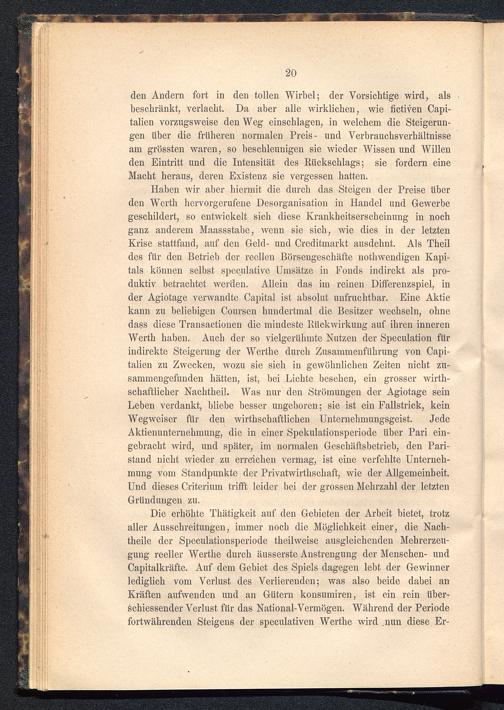 Haben wir aber hiermit die durch das Steigen der Preise überden Werth hervorgerufene Desorganisation in Handel und Gewerbegeschildert, so entwickelt sich diese Krankheitserscheinung in nochganz anderem Maassstabe, wenn sie sich, wie dies in der letztenKrise stattfand, auf den Geld- und Creditmarkt ausdehnt. Als Theildes für den Betrieb der reellen Börsengeschäfte nothwendigen Kapi-tals können selbst spekulative Umsätze in Fonds indirekt als pro-duktiv betrachtet werden. Allein das im reinen Differenzspiel, inder Agiotage verwandte Capital ist absolut unfruchtbar. Eine Aktiekann zu beliebigen Coursen hundertmal die Besitzer wechseln, ohnedass diese Transactionen die mindeste Rückwirkung auf ihren innerenWerth haben. Auch der so vielgerühmte Nutzen der Speculation fürindirekte Steigerung der Werthe durch Zusammenführung von Capi-talien zu Zwecken, wozu sie sich in gewöhnlichen Zeiten nicht zu-sammengefunden hätten, ist, bei Lichte besehen, ein grosser wirt-schaftlicher Nachtheil. Was nur den Strömungen der Agiotage seinLehen verdankt, bliebe besser ungeboren; sie ist ein Fallstrick, keinWegweiser für den wirtschaftlichen Unternehmungsgeist. JedeAktienunternehmung, die in einer Spekulationsperiode über Pari ein-gebracht wird, und später, im normalen Geschäftsbetrieb, den Pari-stand nicht wieder zu erreichen vermag, ist eine verfehlte Unterneh-mung vom Standpunkte der Privatwirtschaft, wie der Allgemeinheit.Und dieses Criterium trifft leider bei der grossen Mehrzahl der letztenGründungen zu.