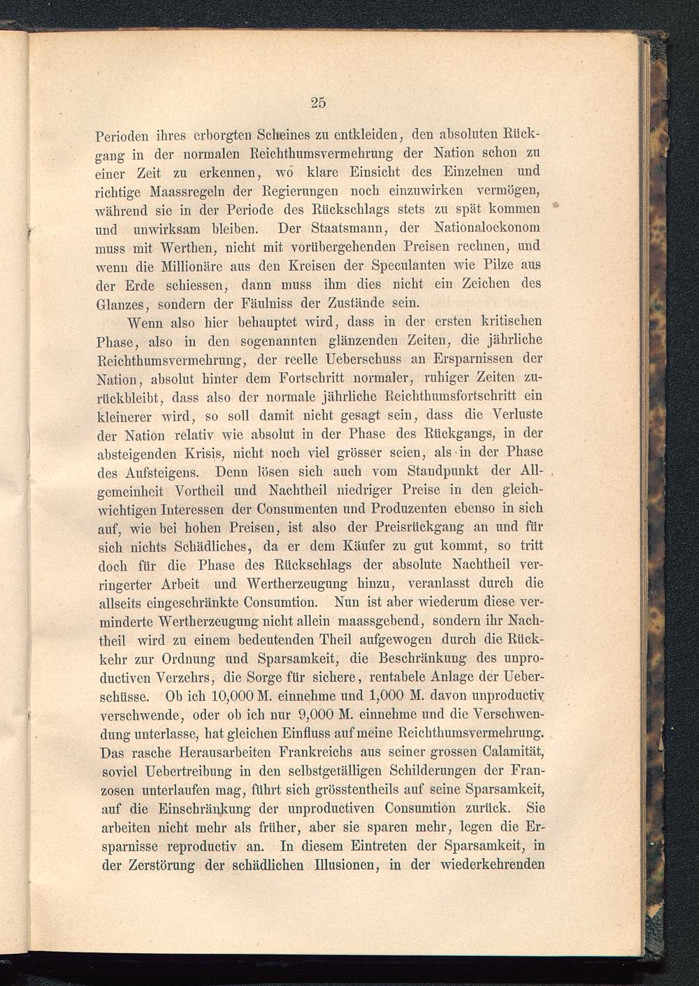 Wenn also hier behauptet wird, dass in der ersten kritischenPhase, also in den sogenannten glänzenden Zeiten, die jährlicheReichthumsvermehrung, der reelle Ueberschuss an Ersparnissen derNation, absolut hinter dem Fortschritt normaler, ruhiger Zeiten zu-rückbleibt, dass also der normale jährliche Reichthmnsfortschritt einkleinerer wird, so soll damit nicht gesagt sein, dass die Verlusteder Nation relativ wie absolut in der Phase des Rückgangs, in derabsteigenden Krisis, nicht noch viel grösser seien, als in der Phasedes Aufsteigens. Denn lösen sich auch vom Standpunkt der All-gemeinheit Vortheil und Nachtheil niedriger Preise in den gleich-wichtigen Interessen der Consumenten und Produzenten ebenso in sichauf, wie bei hohen Preisen, ist also der Preisrückgang an und fürsich nichts Schädliches, da er dem Käufer zu gut kommt, so trittdoch für die Phase des Rückschlags der absolute Nachtheil ver-ringerter Arbeit und Wertherzeugung hinzu, veranlasst durch dieallseits eingeschränkte Consumtion. Nun ist aber wiederum diese ver-minderte Wertherzeugung nicht allein maassgebend, sondern ihr Nach-theil wird zu einem bedeutenden Theil aufgewogen durch die Rück-kehr zur Ordnung und Sparsamkeit, die Beschränkung des unpro-ductiven Verzehrs, die Sorge für sichere, rentabele Anlage der Ueher-schüsse. Ob ich 10,000 M. einnehme und 1,000 M. davon unproductivverschwende, oder ob ich nur 9,000 M. einnehme und die Verschwen-dung unterlasse, hat gleichen Einfluss auf meine Reichthumsvermehrung.Das rasche Herausarbeiten Frankreichs aus seiner grossen Calamität,soviel Uebertreibung in den selbstgefälligen Schilderungen der Fran-zosen unterlaufen mag, führt sich grösstentheils auf seine Sparsamkeit,auf die Einschränkung der unproductiven Consumtion zurück. Siearbeiten nicht mehr als früher, aber sie sparen mehr, legen die Er-sparnisse reproductiv an. In diesem Eintreten der Sparsamkeit, inder Zerstörung der schädlichen Illusionen, in der wiederkehrenden