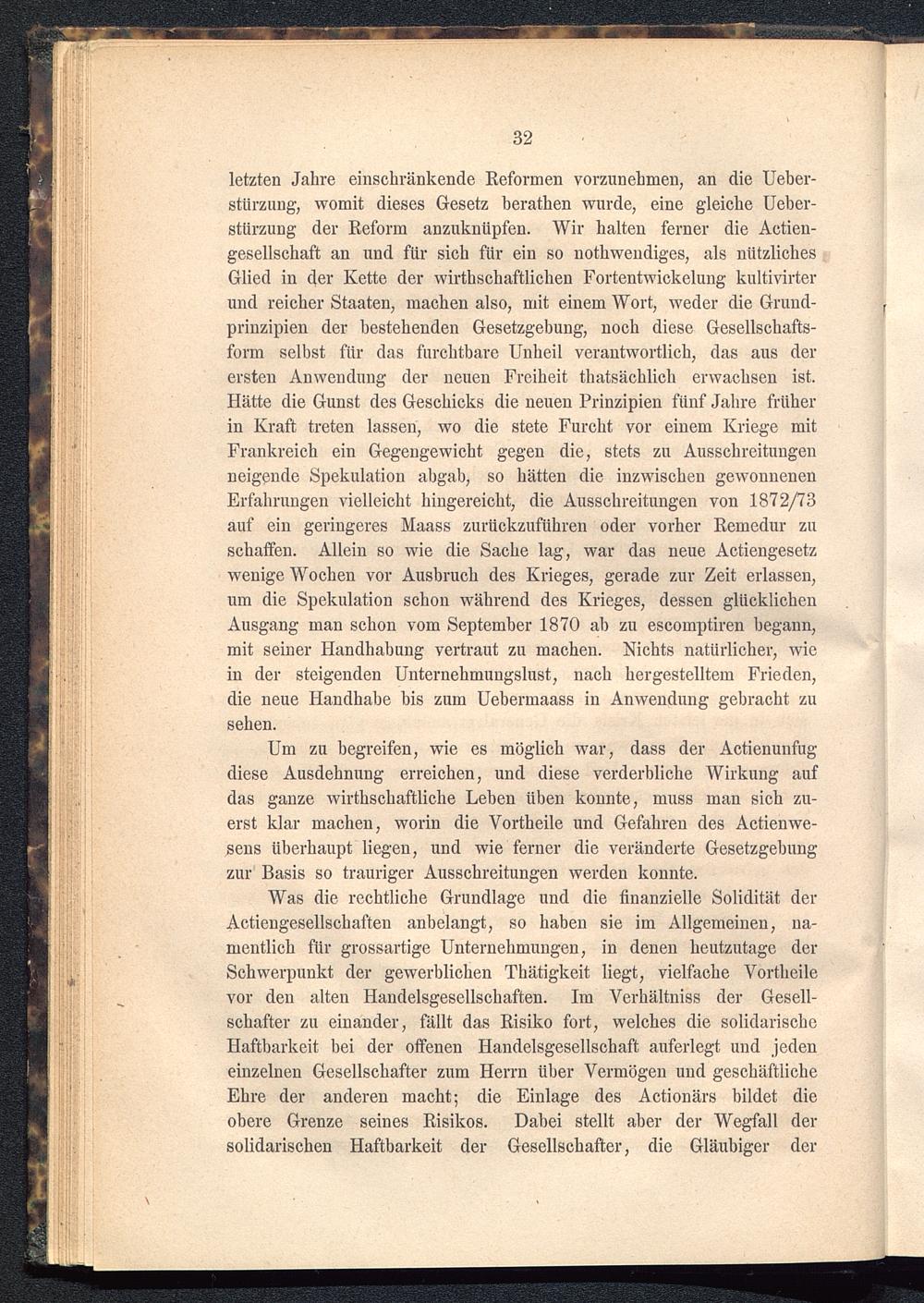 Was die rechtliche Grundlage und die finanzielle Solidität derActiengesellschaften anbelangt, so haben sie im Allgemeinen, na-mentlich für grossartige Unternehmungen, in denen heutzutage derSchwerpunkt der gewerblichen Thätigkeit liegt, vielfache Vortheilevor den alten Handelsgesellschaften. Im Verhältniss der Gesell-schafter zu einander, fällt das Risiko fort, welches die solidarischeHaftbarkeit bei der offenen Handelsgesellschaft auferlegt und jedeneinzelnen Gesellschafter zum Herrn Uber Vermögen und geschäftlicheEhre der anderen macht; die Einlage des Actionärs bildet dieobere Grenze seines Risikos. Dabei stellt aber der Wegfall dersolidarischen Haftbarkeit der Gesellschafter, die Gläubiger der