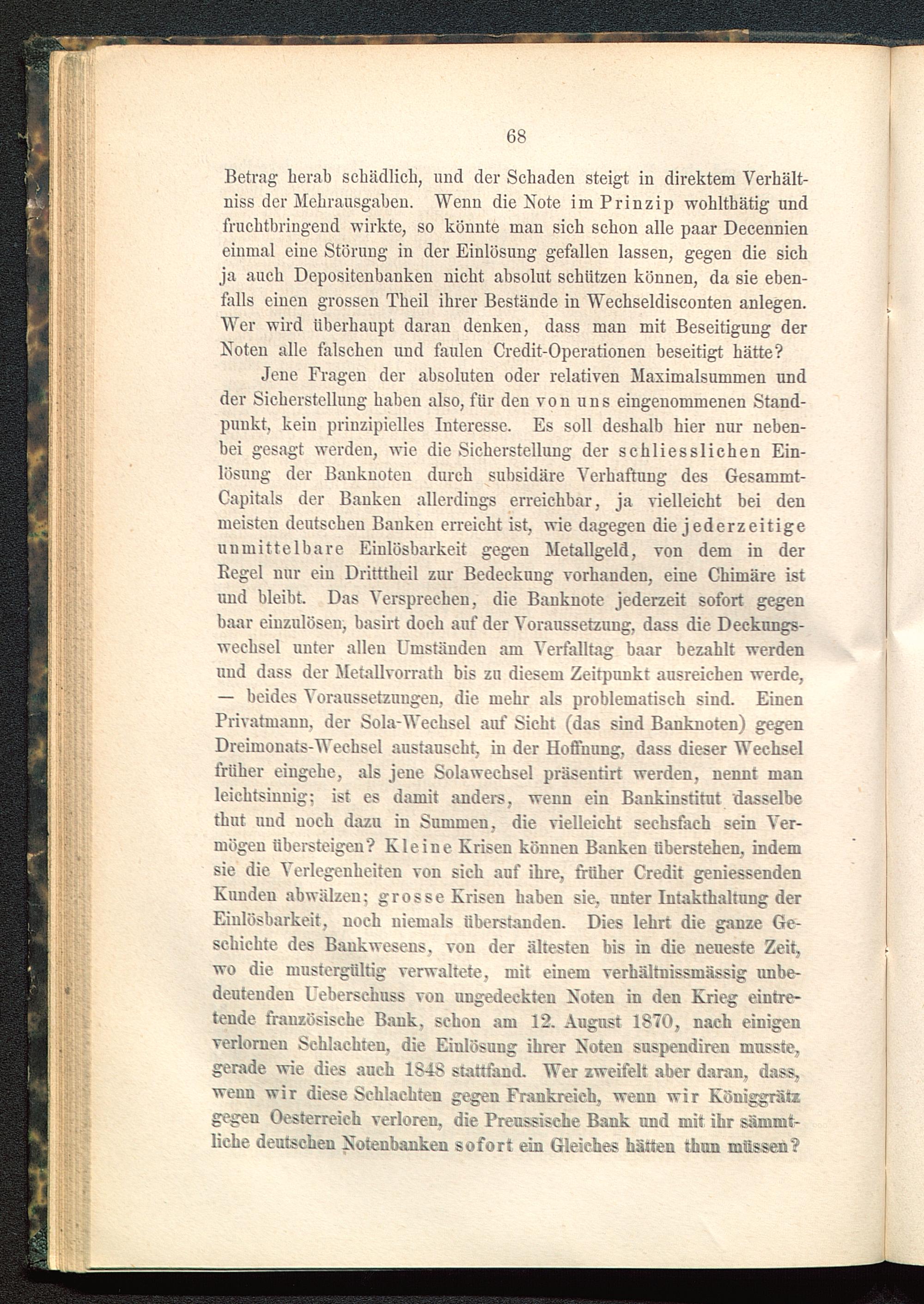 Jene Fragen der absoluten oder relativen Maximalsummen undder Sicherstellung haben also, für den von uns eingenommenen Stand-punkt, kein prinzipielles Interesse. Es soll deshalb hier nur neben-bei gesagt werden, wie die Sicherstellung der schliesslichen Ein-lösung der Banknoten durch subsidäre A 7 erhaftuug des Gesammt-Gapitals der Banken allerdings erreichbar, ja vielleicht bei denmeisten deutschen Banken erreicht ist, wie dagegen die jederzeitigeunmittelbare Einlösbarkeit gegen Metallgeld, von dem in derSegel nur ein Dritttheil zur Bedeckung vorhanden, eine Chimäre istund bleibt. Das A’ersprechen, die Banknote jederzeit sofort gegenbaar einzulösen, basirt doch auf der A'oraussetzuug, dass die Decknngs-wechsel unter allen Umständen am Verfalltag baar bezahlt werdenund dass der Metallvorrath bis zu diesem Zeitpunkt ausreichen werde,— beides Voraussetzungen, die mehr als problematisch sind. EinenPrivatmann, der Sola-Wechsel auf Sicht (das sind Banknoten) gegenDreimonats-AA^echsel austauseht, in der Hoffnung, dass dieser Wechselfrüher eingehe, als jene Solawechsel präsentirt werden, nennt manleichtsinnig; ist es damit anders, wenn ein Bankinstitut dasselbethut uud noch dazu in Summen, die vielleicht sechsfach sein Ver-mögen übersteigen? Kleine Krisen können Banken überstehen, indemsie die Verlegenheiten von sich auf ihre, früher Credit geniessendenKunden abwälzen; grosse Krisen haben sie, unter Intakthaltung derEinlösbarkeit, noch niemals überstanden. Dies lehrt die ganze Ge-schichte des Bankwesens, von der ältesten bis in die neueste Zeit,wo die mustergültig verwaltete, mit einem verhältnissmässig unbe-deutenden L eberschuss von ungedeckten Koten in den Krieg eintre-tende französische Bank, schon am 12. August 1870, nach einigenverlornen Schlachten, die Einlösung ihrer Koten snspendiren musste,gerade wie dies auch 1848 stattfand. Wer zweifelt aber daran, dass,wenn wir diese Schlachten gegen Frankreich , wenn wir Köuiggrützgegen Oesterreich verloren, die Preussische Bank und mit ihr sämmt-liehe deutschen Kotenbanken sofort ein Gleiches hätten thun müssen?
