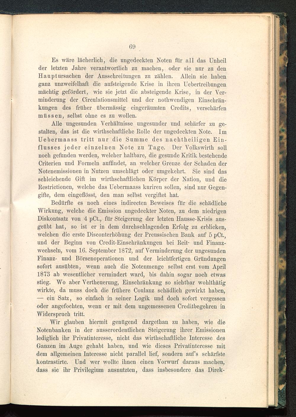 Bedürfte es noch eines indirecten Beweises für die schädlicheWirkung, welche die Emission ungedeckter Noten, zu dem niedrigenDiskontsatz von 4 pCt., für Steigerung der letzten Hausse-Krisis aus-geübt hat, so ist er in dem durchschlagenden Erfolg zu erblicken,welchen die erste Disconterhöhung der Preussischen Bank auf 5 pCt.,und der Beginn von Credit-Einschränkungen bei Reit- und Finanz-wechseln, vom 16. September 1872, auf Verminderung der ungesundenFinanz- und Börsenoperationen und der leichtfertigen Gründungensofort ausübten, wenn auch die Notenmenge selbst erst vom April1873 ab wesentlicher vermindert ward, bis dahin sogar noch etwasstieg. Wo aber Vertheuerung, Einschränkung so sichtbar wohltkätigwirkte, da muss doch die frühere Coulanz schädlich gewirkt haben,— ein Satz, so einfach in seiner Logik und doch sofort vergessenoder angefochten, wenn er mit dem ungemessenen Creditbegehren inWiderspruch tritt.