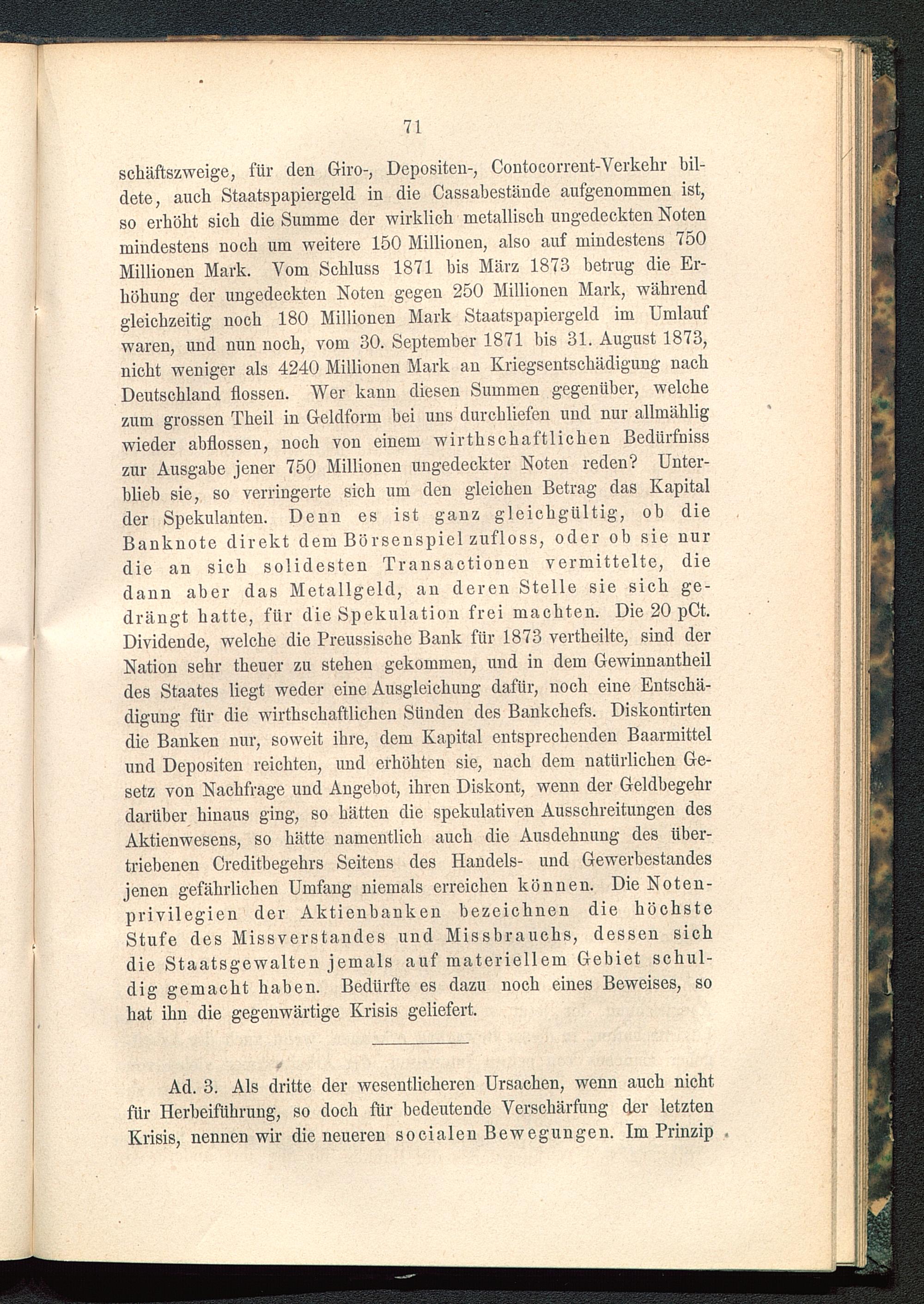 schäftszweige, für den Giro-, Depositen-, Contocorrent-Verkehr bil-dete, auch Staatspapiergeld in die Cassabestände aufgenommen ist,so erhöbt sich die Summe der wirklich metallisch ungedeckten Notenmindestens noch um weitere 150 Millionen, also auf mindestens 750Millionen Mark. Vom Schluss 1871 bis März 1873 betrug die Er-höhung der ungedeckten Noten gegen 250 Millionen Mark, währendgleichzeitig noch 180 Millionen Mark Staatspapiergeld im Umlaufwaren, und nun noch, vom 30. September 1871 bis 31. August 1873,nicht weniger als 4240 Millionen Mark an Kriegsentschädigung nachDeutschland flössen. Wer kann diesen Summen gegenüber, welchezum grossen Theil in Geldform bei uns durchliefen und nur allmähligwieder abflossen, noch von einem wirthschaftlichen Bedürfnisszur Ausgabe jener 750 Millionen ungedeckter Noten reden? Unter-blieb sie, so verringerte sich um den gleichen Betrag das Kapitalder Spekulanten. Denn es ist ganz gleichgültig, ob dieBanknote direkt dem Börsenspiel zufloss, oder ob sie nurdie an sich solidesten Transactionen vermittelte, diedann aber das Metallgeld, an deren Stelle sie sich ge-drängt hatte, für die Spekulation frei machten. Die 20 pCt.Dividende, welche die Preussisehe Bank für 1873 vertheilte, sind derNation sehr theuer zu stehen gekommen, und in dem Gewinnantheildes Staates liegt weder eine Ausgleichung dafür, noch eine Entschä-digung für die wirthschaftlichen Sünden des Bankchefs. Diskontirtendie Banken nur, soweit ihre, dem Kapital entsprechenden Baarmittelund Depositen reichten, und erhöhten sie, nach dem natürlichen Ge-setz von Nachfrage und Angebot, ihren Diskont, wenn der Geldbegehrdarüber hinaus ging, so hätten die spekulativen Ausschreitungen desAktienwesens, so hätte namentlich auch die Ausdehnung des über-triebenen Creditbegehrs Seitens des Handels- und Gewerbestandesjenen gefährlichen Umfang niemals erreichen können. Die Noten-privilegien der Aktienbanken bezeichnen die höchsteStufe des Missverstandes und Missbrauchs, dessen sichdie Staatsgewalten jemals auf materiellem Gebiet schul-dig gemacht haben. Bedürfte es dazu noch eines Beweises, sohat ihn die gegenwärtige Krisis geliefert.