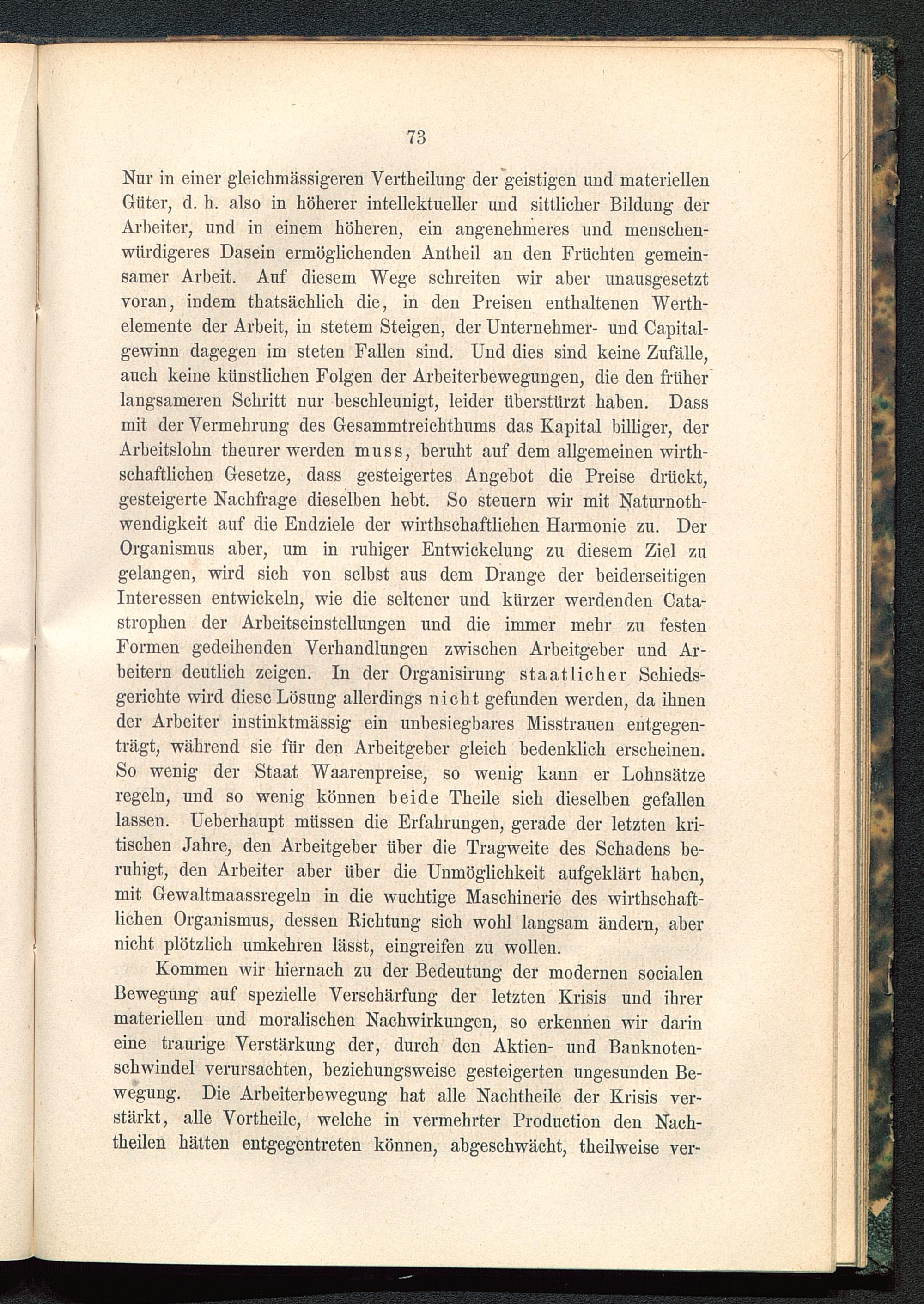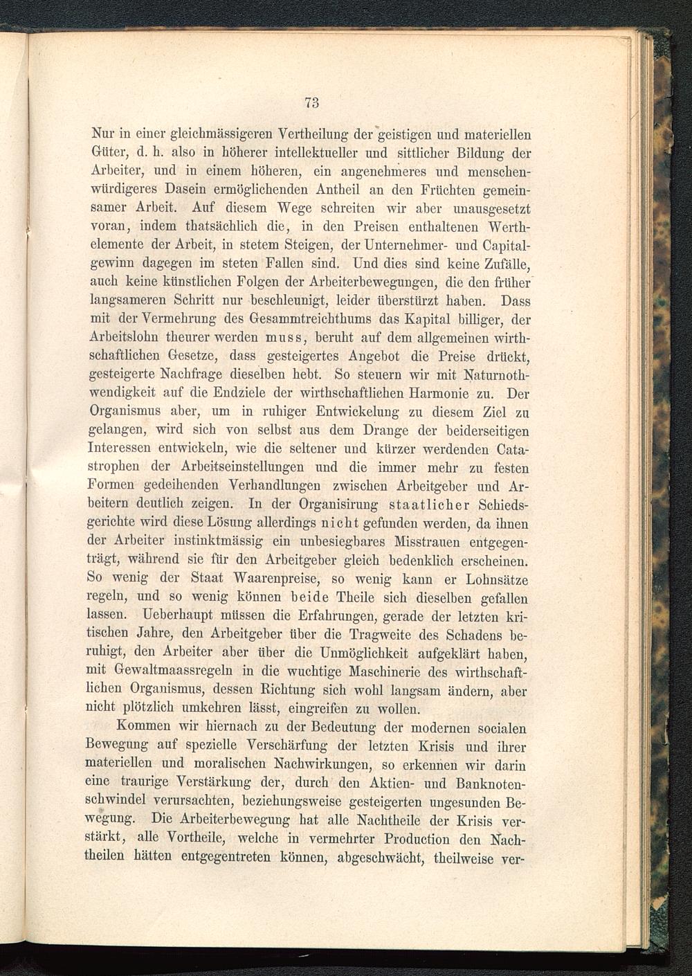 Kommen wir hiernach zu der Bedeutung der modernen socialenBewegung auf spezielle Verschärfung der letzten Krisis und ihrermateriellen und moralischen Nachwirkungen, so erkennen wir darineine traurige Verstärkung der, durch den Aktien- und Banknoten-schwindel verursachten, beziehungsweise gesteigerten ungesunden Be-wegung. Die Arbeiterbewegung hat alle Nachtheile der Krisis ver-stärkt, alle Vortheile, welche in vermehrter Production den Nach-theilen hätten entgegentreten können, abgeschwächt, theilweise ver-
