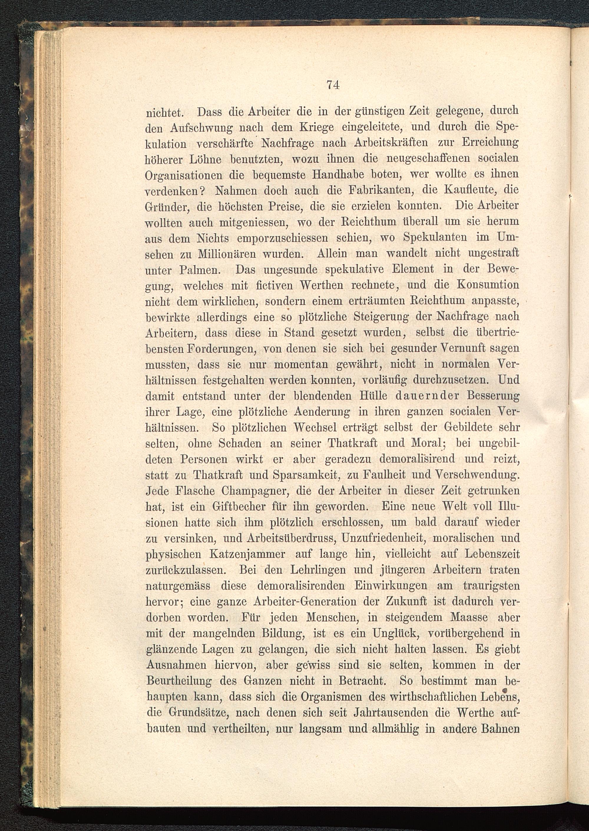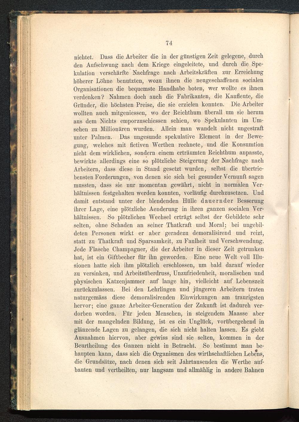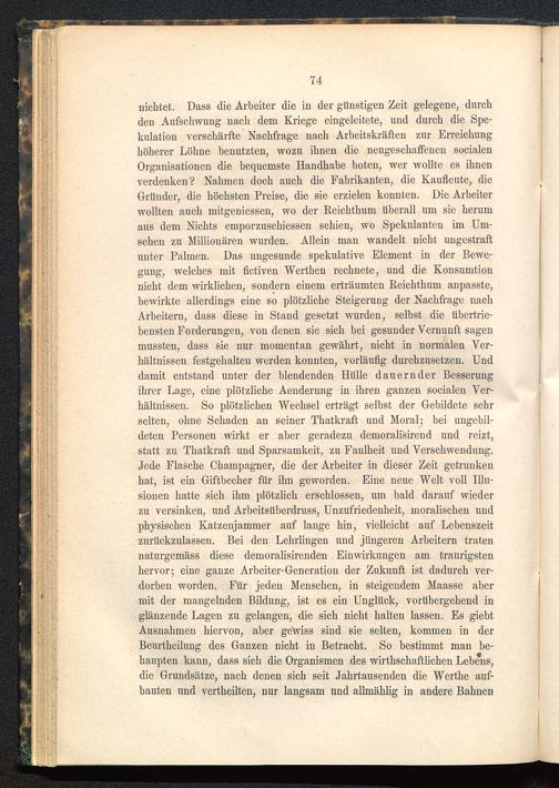 nichtet. Dass die Arbeiter die in der günstigen Zeit gelegene, durchden Aufschwung nach dem Kriege eingeleitete, und durch die Spe-kulation verschärfte Nachfrage nach Arbeitskräften zur Erreichunghöherer Löhne benutzten, wozu ihnen die neugeschaffenen socialenOrganisationen die bequemste Handhabe boten, wer wollte es ihnenverdenken? Nahmen doch auch die Fabrikanten, die Kaufleute, dieGründer, die höchsten Preise, die sie erzielen konnten. Die Arbeiterwollten auch mitgeniessen, wo der Reichthum überall um sie herumaus dem Nichts emporzuschiessen schien, wo Spekulanten im Um-sehen zu Millionären wurden. Allein man wandelt nicht ungestraftunter Palmen. Das ungesunde spekulative Element in der Bewe-gung, welches mit fictiven Werthen rechnete, und die Konsumtionnicht dem wirklichen, sondern einem erträumten Reichthum anpasste,bewirkte allerdings eine so plötzliche Steigerung der Nachfrage nachArbeitern, dass diese in Stand gesetzt wurden, selbst die übertrie-bensten Forderungen, von denen sie sich bei gesunder Vernunft sagenmussten, dass sie nur momentan gewährt, nicht in normalen Ver-hältnissen festgehalten werden konnten, vorläufig durchzusetzen. Unddamit entstand unter der blendenden Hülle dauernder Besserungihrer Lage, eine plötzliche Aenderung in ihren ganzen socialen Ver-hältnissen. So plötzlichen Wechsel erträgt selbst der Gebildete sehrselten, ohne Schaden an seiner Thatkraft und Moral; bei ungebil-deten Personen wirkt er aber geradezu demoralisirend und reizt,statt zu Thatkraft und Sparsamkeit, zu Faulheit und Verschwendung.Jede Flasche Champagner, die der Arbeiter in dieser Zeit getrunkenhat, ist ein Giftbecher für ihn geworden. Eine neue Welt voll Illu-sionen hatte sich ihm plötzlich erschlossen, um bald darauf wiederzu versinken, und Arbeitsüberdruss, Unzufriedenheit, moralischen undphysischen Katzenjammer auf lange hin, vielleicht auf Lebenszeitzurückzulassen. Bei den Lehrlingen und jüngeren Arbeitern tratennaturgemäss diese demoralisirenden Einwirkungen am traurigstenhervor; eine ganze Arbeiter-Generation der Zukunft ist dadurch ver-dorben worden. Für jeden Menschen, in steigendem Maasse abermit der mangelnden Bildung, ist es ein Unglück, vorübergehend inglänzende Lagen zu gelangen, die sich nicht halten lassen. Es giebtAusnahmen hiervon, aber gewiss sind sie selten, kommen in derBeurtheilung des Ganzen nicht in Betracht. So bestimmt man be-haupten kann, dass sich die Organismen des wirtschaftlichen Lehens,die Grundsätze, nach denen sich seit Jahrtausenden die Werthe auf-bauten und vertheilten, nur langsam und allmählig in andere Bahnen