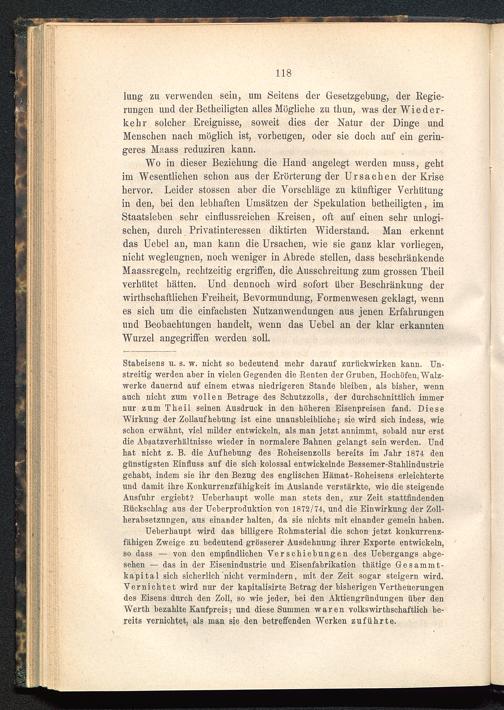 Stabeisens u. s. w. nicht so bedeutend mehr darauf zurückwirken kann. Un-streitig werden aber in vielen Gegenden die Renten der Gruben, Hochöfen, Walz-werke dauernd auf einem etwas niedrigeren Stande bleiben, als bisher, wennauch nicht zum vollen Betrage des Schutzzolls, der durchschnittlich immernur zum Theil seinen Ausdruck in den höheren Eisenpreisen fand. DieseWirkung der Zoflauf hebung ist eine unausbleibliche; sie wird sich indess, wieschon erwähnt, viel milder entwickeln, als man jetzt annimmt, sobald nur erstdie Absatzverhältnisse wieder in normalere Bahnen gelangt sein werden. Undhat nicht z. B. die Aufhebung des Roheisenzolls bereits im Jahr 1874 dengünstigsten Einfluss auf die sich kolossal entwickelnde Bessemer-Stahlindustriegehabt, indem sie ihr den Bezug des englischen Hämat-Roheisens erleichterteund damit ihre Konkurrenzfähigkeit im Auslande verstärkte, wie die steigendeAusfuhr ergiebt? Ueberhaupt wolle man stets den, zur Zeit stattfindendenRückschlag aus der Ueberproduktion von 1872/74, und die Einwirkung der Zoll-herabsetzungen, aus einander halten, da sie nichts mit einander gemein haben.