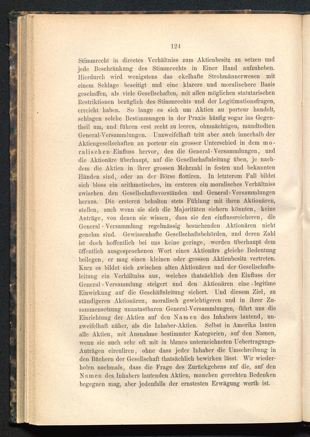 Stimmrecht iu directes Verhältniss zum Aktienbesitz zu setzen undjede Beschränkung des Stimmrechts in Einer Hand aufzuheben.Hierdurch wird wenigstens das ekelhafte Strohmännerwesen miteinem Schlage beseitigt und eine klarere und moralischere Basisgeschaffen, als viele Gesellschaften, mit allen möglichen statutarischenRestriktionen bezüglich des Stimmrechts und der Legitimationsfragen,erreicht haben. So lange es sich um Aktien au porteur handelt,schlagen solche Bestimmungen in der Praxis häutig sogar ins Gegen-theil um, nnd führen erst recht zu leeren, ohnmächtigen, mundtodtenGeneral-Versammlungen. Unzweifelhaft tritt aber auch innerhalb derAktiengesellschaften au porteur ein grosser Unterschied in dem mo-ralischen Einfluss hervor, den die General-Versammlungen, unddie Aktionäre überhaupt, auf die Gesellschaftsleitung üben, je nach-dem die Aktien in ihrer grossen Mehrzahl in festen und bekanntenHänden sind, oder an der Börse flottiren. In letzterem Fall bildetsich bloss ein arithmetisches, im ersteren ein moralisches Verhältnisszwischen den Gesellschaftsvorständen und General-Versammlungenheraus. Die erstereil behalten stets Fühlung mit ihren Aktionären,stellen, auch weun sie sich die Majoritäten sichern könnten, keineAnträge, von denen sie wissen, dass sie den einflussreicheren, dieGeneral - Versammlung regelmässig besuchenden Aktionären nichtgenehm sind. Gewissenhafte Gesellschaftsbehörden, und deren Zahlist doch hoffentlich bei uns keine geringe, werden überhaupt demöffentlich ausgesprochenen Wort eines Aktionärs gleiche Bedeutungbeilegen, er mag einen kleinen oder grossen Aktienbesitz vertreten.Kurz es bildet sich zwischen alten Aktionären und der Gesellschafts-leitung ein Verhältniss aus, welches thatsächlich den Einfluss derGeneral - Versammlung steigert und den Aktionären eine . legitimeEinwirkung auf die Geschäftsleitung sichert. Und diesem Ziel, zuständigeren Aktionären, moralisch gewichtigeren und in ihrer Zu-sammensetzung unantastbaren General-Versammlungen, führt uns dieEinrichtung der Aktien auf den Namen des Inhabers lautend, un-zweifelhaft näher, als die Inhaber-Aktien. Selbst in Amerika lautenalle Aktien, mit Ausnahme bestimmter Kategorien, auf den Namen,wenn sie auch sehr oft mit in blanco Unterzeichneten Uebertragungs-Anträgen circulireu, ohne dass jeder Inhaber die Umschreibung inden Büchern der Gesellschaft thatsächlich bewirken lässt. Wir wieder-holen nochmals, dass die Frage des Zurückgehens auf die, auf denNamen des. Inhabers lautenden Aktien, manchen gerechten Bedenkenbegegnen mag, aber jedenfalls der ernstesten Erwägung werth ist.