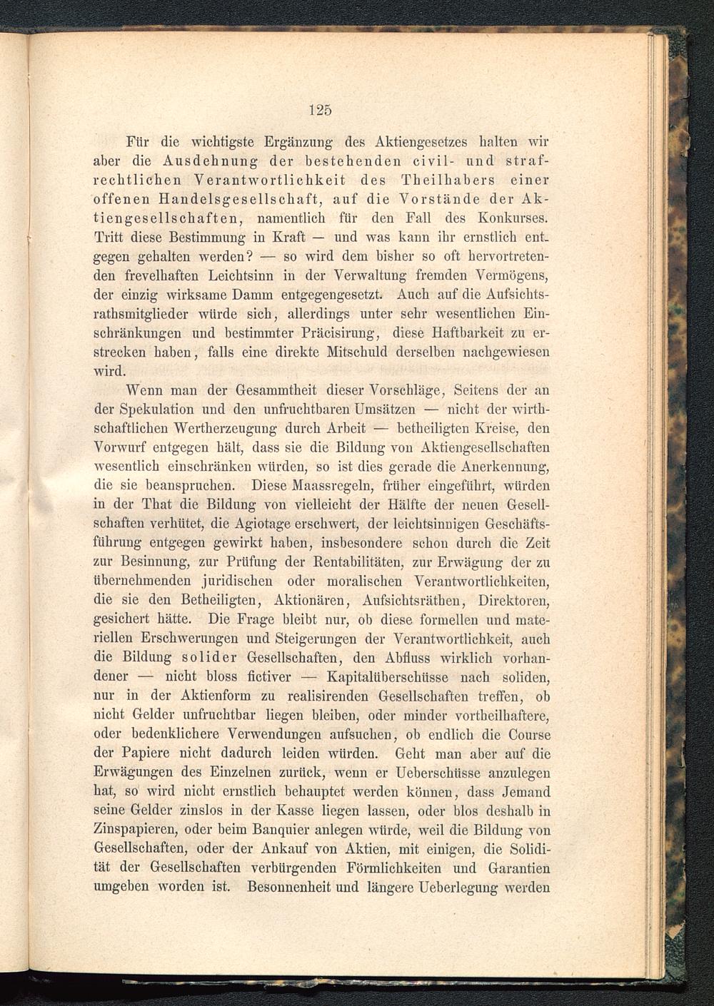 Für die wichtigste Ergänzung des Aktiengesetzes halten wiraber die Ausdehnung der bestehenden civil- und straf-rechtlichen Verantwortlichkeit des Theilhabers eineroffenen Handelsgesellschaft, auf die Vorstände der Ak-tiengesellschaften, namentlich für den Fall des Konkurses.Tritt diese Bestimmung in Kraft — und was kann ihr ernstlich ent.gegen gehalten werden? — so wird dem bisher so oft hervortreten-den frevelhaften Leichtsinn in der Verwaltung fremden Vermögens,der einzig wirksame Damm entgegengesetzt. Auch auf die Aufsichts-rathsmitglieder würde sich, allerdings unter sehr -wesentlichen Ein-schränkungen und bestimmter Präcisirung, diese Haftbarkeit zu er-strecken haben, falls eine direkte Mitschuld derselben nachgewiesenwird.