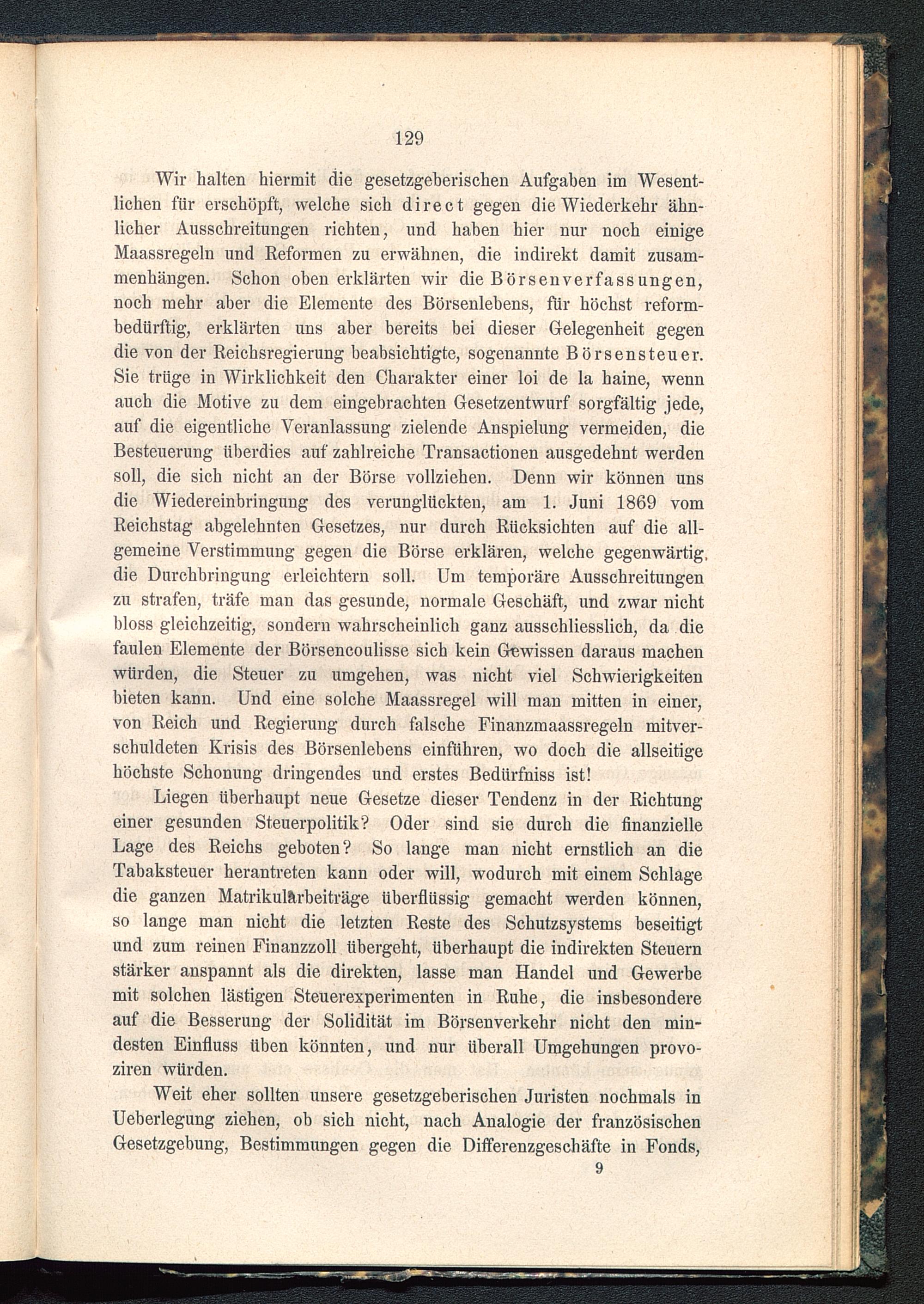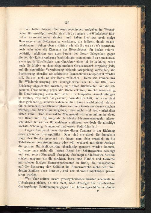 Wir halten hiermit die gesetzgeberischen Aufgaben im Wesent-lichen für erschöpft, welche sich direct gegen die Wiederkehr ähn-licher Ausschreitungen richten, und haben hier nur noch einigeMaassregeln und Reformen zu erwähnen, die indirekt damit Zusam-menhängen. Schon oben erklärten wir die Börsenverfassungen,noch mehr aber die Elemente des Börsenlebens, für höchst reform-bedürftig, erklärten uns aber bereits bei dieser Gelegenheit gegendie von der Reichsregierung beabsichtigte, sogenannte Börsensteuer.Sie trüge in Wirklichkeit den Charakter einer loi de la haine, wennauch die Motive zu dem eingebrachten Gesetzentwurf sorgfältig jede,auf die eigentliche Veranlassung zielende Anspielung vermeiden, dieBesteuerung überdies auf zahlreiche Transactionen ausgedehnt werdensoll, die sich nicht an der Börse vollziehen. Denn wir können unsdie Wiedereinbringung des verunglückten, am 1. Juni 1869 vomReichstag abgelehnten Gesetzes, nur durch Rücksichten auf die all-gemeine Verstimmung gegen die Börse erklären, welche gegenwärtig,die Durchbringung erleichtern soll. Um temporäre Ausschreitungenzu strafen, träfe man das gesunde, normale Geschäft, und zwar nichtbloss gleichzeitig, sondern wahrscheinlich ganz ausschliesslich, da diefaulen Elemente der Börsencoulisse sich kein Gewissen daraus machenwürden, die Steuer zu umgehen, was nicht viel Schwierigkeitenbieten kann. Und eine solche Maassregel will man mitten in einer,von Reich und Regierung durch falsche Finanzmaassregeln mitver-schuldeten Krisis des Börsenlebens einführen, wo doch die allseitigehöchste Schonung dringendes und erstes Bedürfniss ist!
