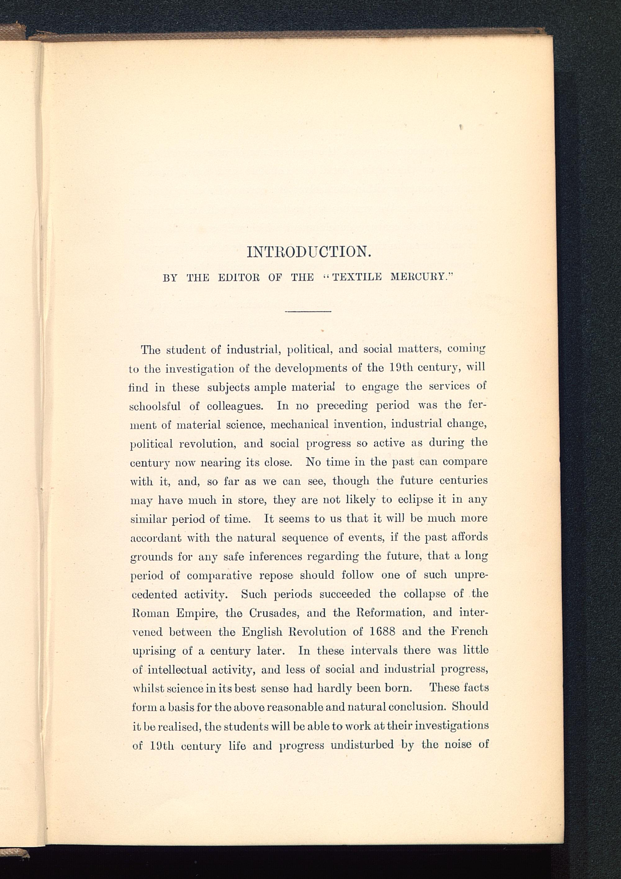 The student of industrial, political, and social matters, comingto the investigation of the developments of the 19th century, willfind in these subjects ample materia! to engage the services ofschoolsful of colleagues. In no preceding period was the fer-ment of material science, mechanical invention, industrial change,political revolution, and social progress so active as during thecentury now nearing its close. No time in the past can comparewith it, and, so far as we can see, though the future centuriesmay have much in store, they are not likely to eclipse it in anysimilar period of time. It seems to us that it will be much moreaccordant with the natural sequence of events, if the past affordsgrounds for any safe inferences regarding the future, that a longperiod of comparative repose should follow’ one of such unpre-cedented activity. Such periods succeeded the collapse of theRoman Empire, the Crusades, and the Reformation, and inter-vened between the English Revolution of 1688 and the Frenchuprising of a century later. In these intervals there was littleof intellectual activity, and less of social and industrial progress,whilst science in its best sense had hardly been born. These factsform a basis for the above reasonable and natural conclusion. Shouldit be realised, the students will be able to work at their investigationsof 19th century life und progress undisturbed by the noise of