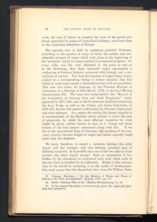 The opposite view is held by numerous practical Germans .According to the opinion of many of these, the sudden and con-siderable increase of wages which took place at the beginning ofthe “seventies” has by no means resulted in economical progress. Onmany sides was the view defended, in the press as well asin the Reichstag , that these increased wages represented aweakening of German industry compared with foreign, and a cur-tailment of exports. Far from the increase of wages being accom-panied by a corresponding raising of labour capacity, they hadrather in most cases caused a diminution in the work accomplished.This view was taken, for instance, by the Prussian Minister ofCommerce, in a Rescript of 28th March, 1876, to the head MiningDepartments (39). The same view is expressed in the “Memoir ofthe Association of German Iron and Steel Employers” whichappeared in 1875 (40), and in the Government inquiries concerningthe Iron Trade, as well as the Cotton and Linen Industries, in1878 (41), herein with special confirmation by German ironmastersand some spinners. As a means for raising the labour capacity itis recommended, in the Rescript above quoted, to lower the rateof piecework, by which the most effectual incentive for -workwould be given—advice similar to that of A. Young and thosewriters of the last century mentioned along with him. If wehie to the agricultural East of Germany , the teaching of the con-trary relation between height of wages and labour capacity wouldmeet with few doubters.