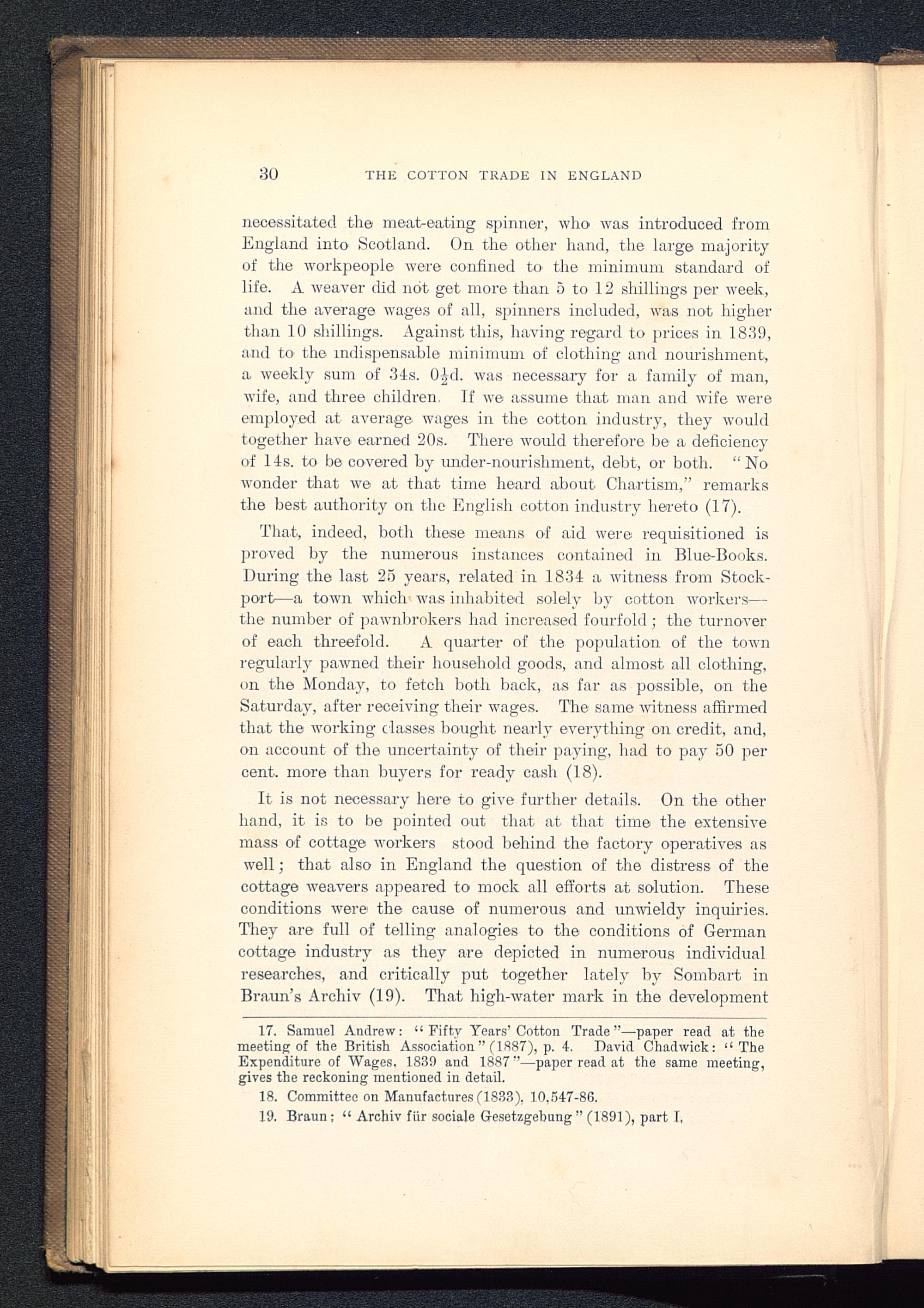 17. Samuel Andrew: “Fifty Years’Cotton Trade”—paper read at themeeting of the British Association ” ("1887), p. 4. David Chadwick: “TheExpenditure of Wages, 1839 and 1887”—paper read at the same meeting,gives the reckoning mentioned in detail.
