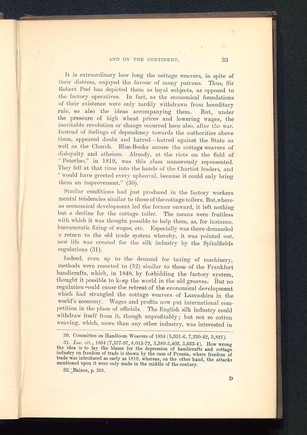 31. Loc. cit ., 1834 (7,577-97, 8,015-72, 5,389-5,403, 5,633-4). How wrongthe idea is to lay the blame for the depression of handicrafts and cottageindustry on freedom of trade is shown hy the case of Prussia , where freedom oftrade was introduced as early as 1810, whereas, on the other hand, the attacksmentioned upon it were only made in the middle of the century.