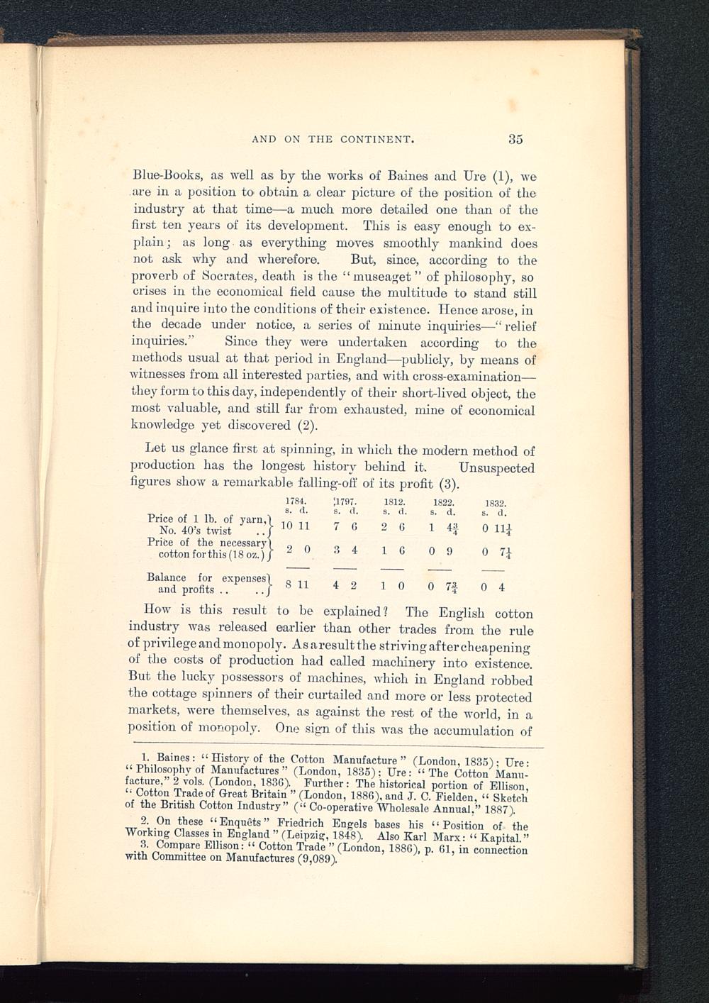 1. Baines: “ History of the Cotton Manufacture” (London , 1835); Ure:“ Philosophy of Manufactures” (London , 1835): Ure: “The Cotton Manu-facture,” 2 vols. (London , 183G). Further: The historical portion of Ellison,“ Cotton Trade of Great Britain ” (London , 1880), and J. C. Fielden, “ Sketchof the British Cotton Industry” (“ Co-operative Wholesale Annual,” 1887).