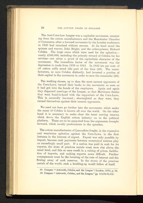 We need not here go further into the movement, which underthe name of Cobden is known all over the world. On the otherhand it is necessary to make clear the inner moving reasonswhich drove the English cotton industry on to the politicalplatform. These are to be separated from the arguments broughtforward, which mostly predominate in the speeches.