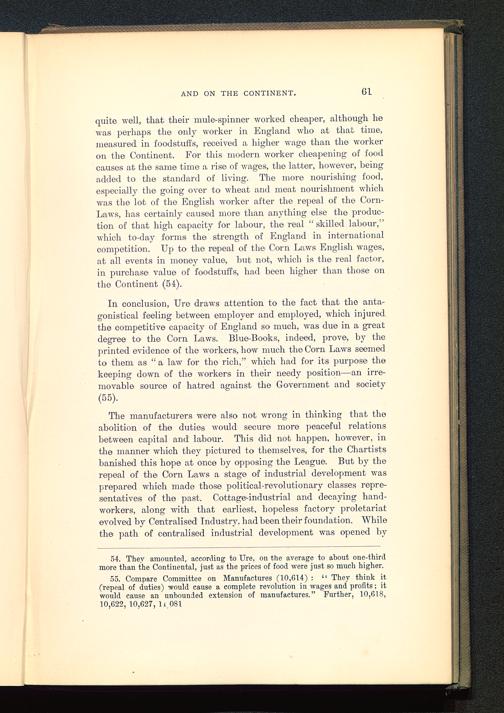 In conclusion, Ure draws attention to the fact that the anta-gonistical feeling between employer and employed, which injuredthe competitive capacity of England so much, was due in a greatdegree to the Corn Laws. Blue-Books, indeed, prove, by theprinted evidence of the workers, how much the Corn Laws seemedto them as “ a law for the rich,” which had for its purpose thekeeping down of the workers in their needy position—an irre-movable source of hatred against the Government and society(55).
