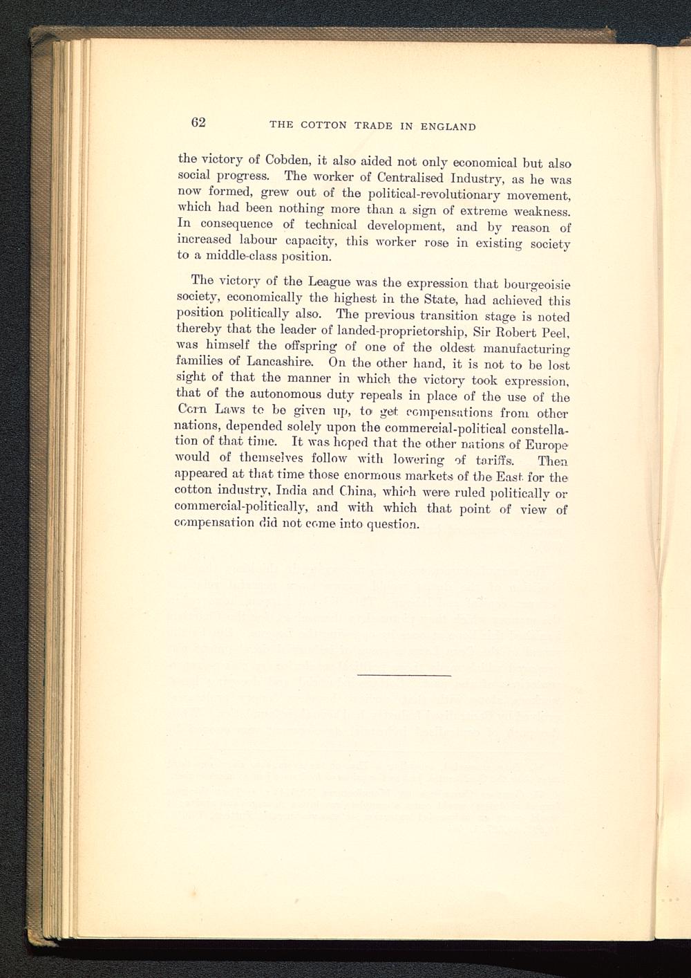The victory of the League was the expression that bourgeoisiesociety, economically the highest in the State, had achieved thisposition politically also. The previous transition stage is notedthereby that the leader of landed-proprietorship, Sir Robert Peel ,was himself the offspring of one of the oldest manufacturingfamilies of Lancashire . On the other hand, it is not to be lostsight of that the manner in which the victory took expression,that of the autonomous duty repeals in place of the use of theCorn Laws to bo given up, to get compensations from othernations, depended solely upon the commercial-political constella-tion of that time. It was hoped that the other nations of Europe would of themselves follow with lowering of tariffs. Thenappeared at that time those enormous markets of the East for thecotton industry, India and China, which were ruled politically oreommercial-politically, and with which that point of view ofcompensation did not come into question.