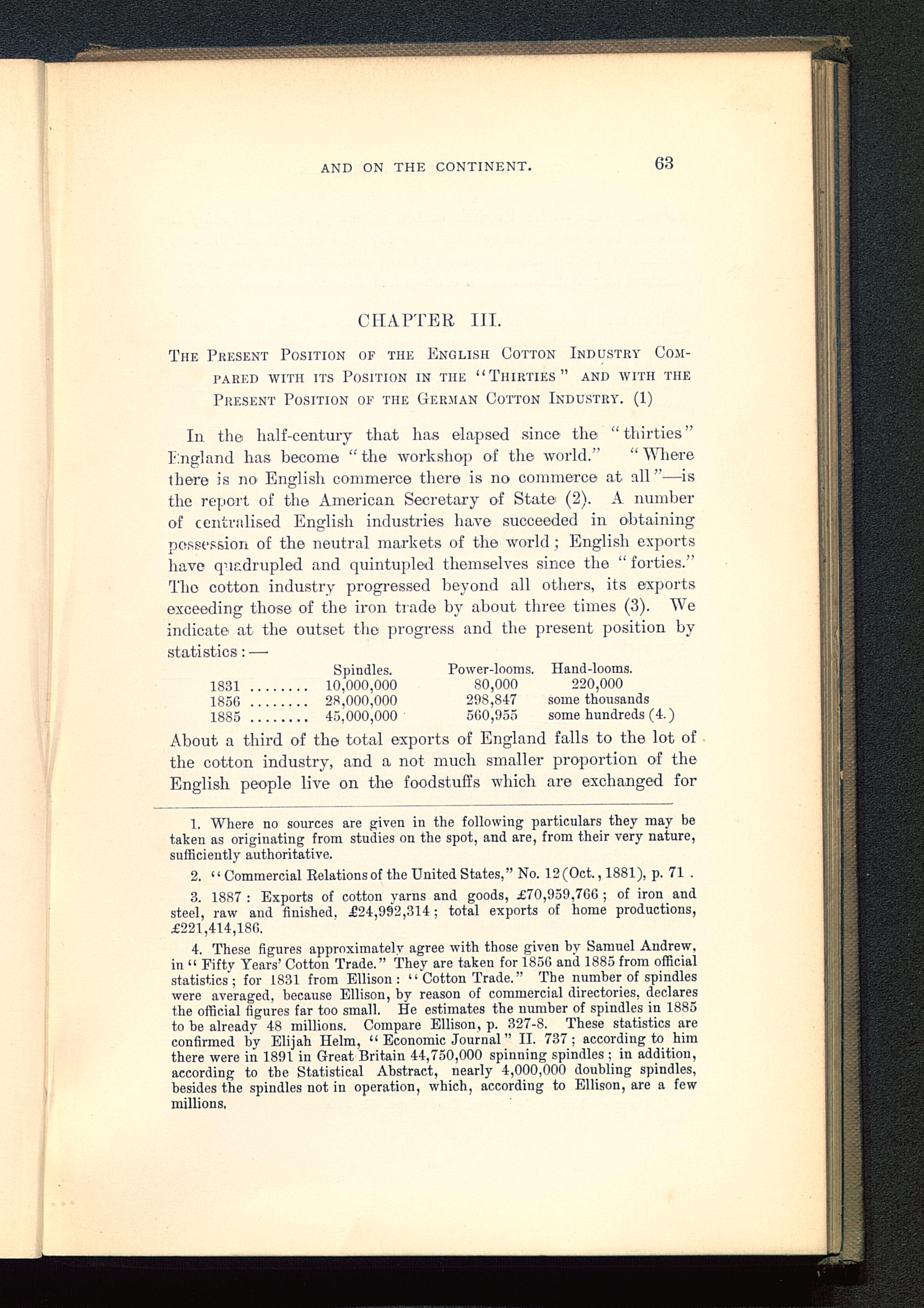 4. These figures approximately agree with those given by Samuel Andrew,in “ Fifty Years’ Cotton Trade.” They are taken for 1850 anil 1885 from officialstatistics ; for 1831 from Ellison : 1 2 3 4 ‘ Cotton Trade. ” The number of spindleswere averaged, because Ellison, by reason of commercial directories, declaresthe official figures far too small. He estimates the number of spindles in 1885to be already 48 millions. Compare Ellison, p. 327-8. These statistics areconfirmed by Elijah Helm, “ Economic Journal ” II. 737; according to himthere were in 1891 in Great Britain 44,750,000 spinning spindles ; in addition,according to the Statistical Abstract, nearly 4,000,000 doubling spindles,besides the spindles not in operation, which, according to Ellison, are a fewmillions.