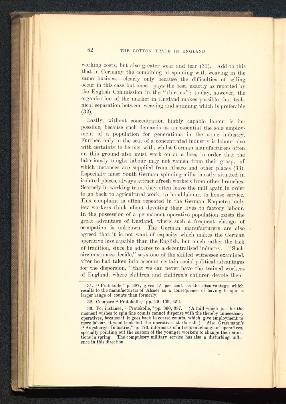33. For instance, “ Protokolle,” pp. 360, 387. (A mill which just for themoment wishes to spin fine counts cannot dispense with the thereby unnecessaryoperatives, because if it goes hack to coarse counts, which give employment tomore labour, it would not find the operatives at its call.) Also Grassmann ’s“ Augshurger Industrie,” p. 17G, informs us of a frequent change of operatives,specially pointing out the custom of the younger workers to change their situa-tions in spring. The compulsory military service has also a disturbing influ-ence in this direction.