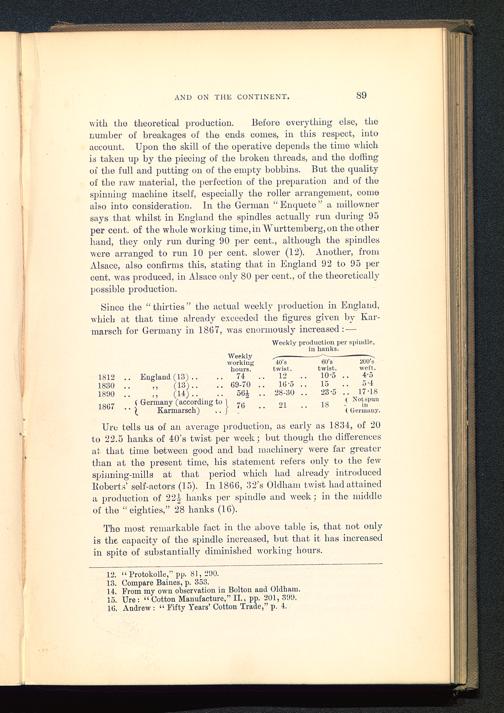 Urc tells us of an average production, as early as 1834, of 20to 22.5 hanks of 40’s twist per week; but though the differencesat that time between good and bad machinery were far greaterthan at the present time, his statement refers only to the fewspinning-mills at that period which had already introducedI{oberts’ self-actors (15). In I860, 32’s Oldham twist had attaineda production of 224 hanks per spindle and week; in the middleof the “eighties,” 28 hanks (16).