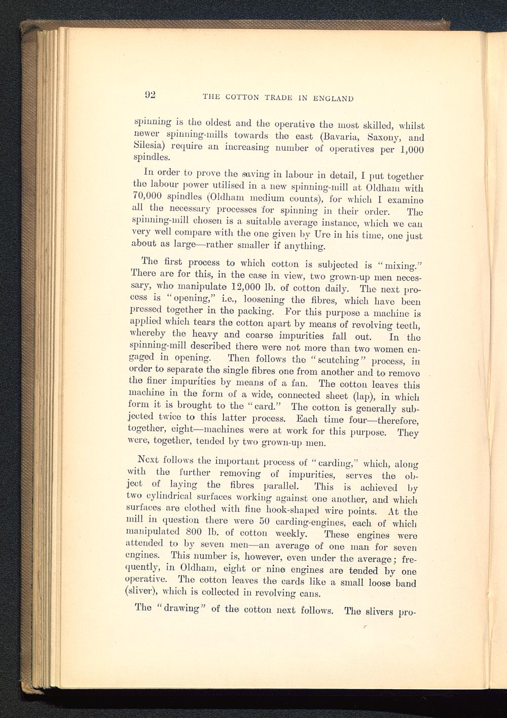 The first process to which cotton is subjected is “ mixing.”There are for this, in the case in view, two grown-up men neces-sary, who manipulate 12,000 lb. of cotton daily. The next pro-cess is “ opening,” i.e., loosening the fibres, which have beenpressed together in the packing. For this purpose a machine isapplied which tears the cotton apart by means of revolving teeth,whereby tho heavy and coarse impurities fall out. In thespinning-mill described there were not more than two women en-gaged in opening. Then follows the “ scutching ” process, inorder to separate the single fibres one from another and to removothe finer impurities by means of a fan. The cotton leaves thismachine in the form of a wide, connected sheet (lap), in whichform it is brought to the “card.” The cotton is generally sub-jected twice to this latter process. Each time four—therefore,together, eight—machines were at work for this purpose. Theywere, together, tended by two grown-up men.
