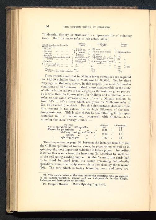 These results show that in Oldham fewer operatives are requiredfor 70,(100 spindles than in Mulhouse for 32,000. Yet by thesevery figures Mulhouse shows, in this respect, the most favourableconditions of all Germany . Much more unfavourable is the stateof affairs in the valleys of the Vosges, as the instance given proves.It is true that the figures given for Oldham and Mulhouse do notrefer to the same average counts of yarn; Oldham medium isfrom 36’,s to 40’s; those which are given for Mulhouse refer toNo. 20's French (metrical). But this circumstance does not comeinto account in the extraordinarily high difference of the fore-going instances. This is also shown by the following fairly repre-sentative mill in Switzerland , compared with Oldham—bothspinning the same average counts: —