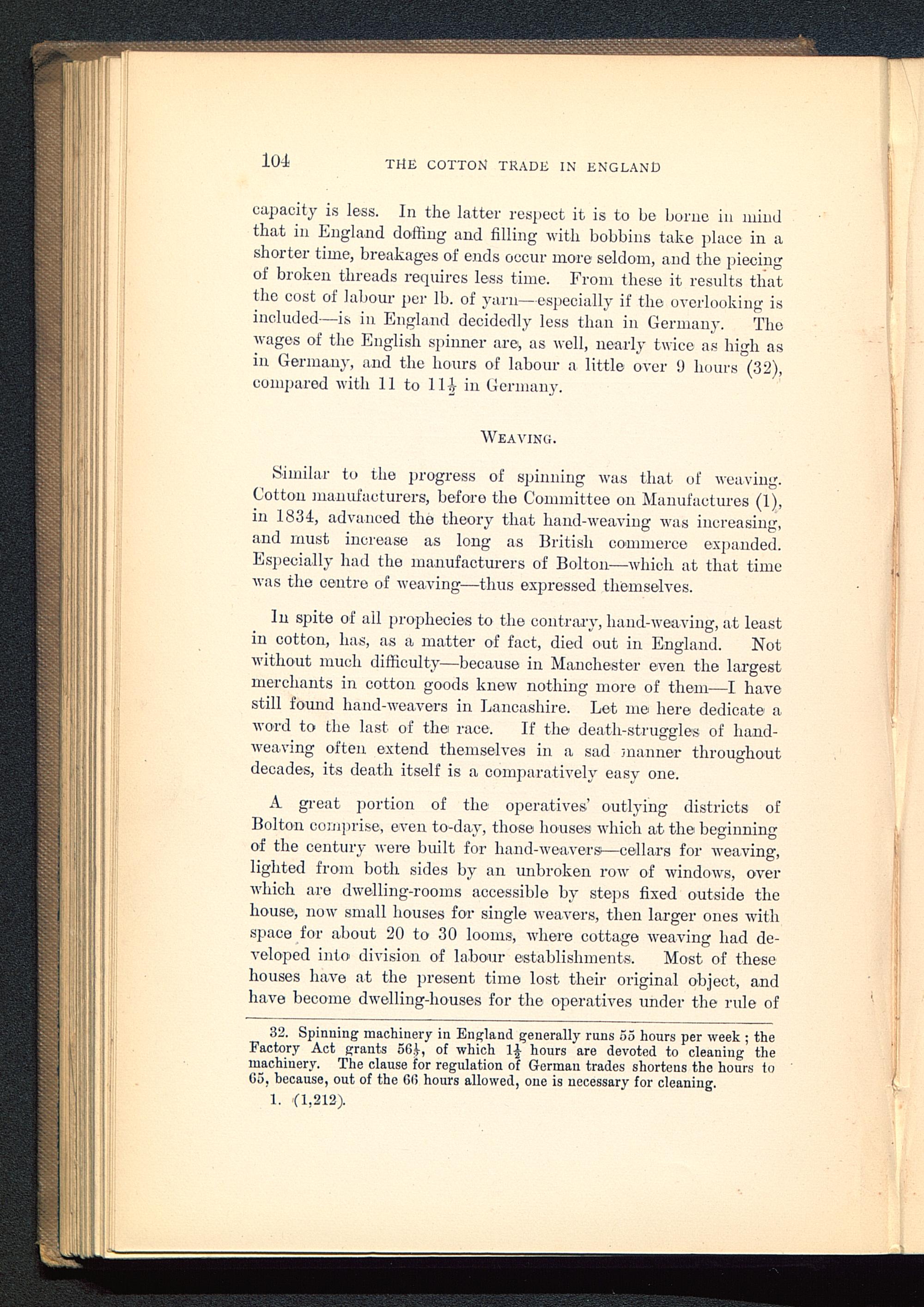 Similar to the progress of spinning was that of weaving.Cotton manufacturers, before the Committee on Manufactures (1),in 1834, advanced the theory that hand-weaving was increasing,and must increase as long as British commerce expanded.Especially had the manufacturers of Bolton—which at that timewas the centre of weaving—thus expressed themselves.