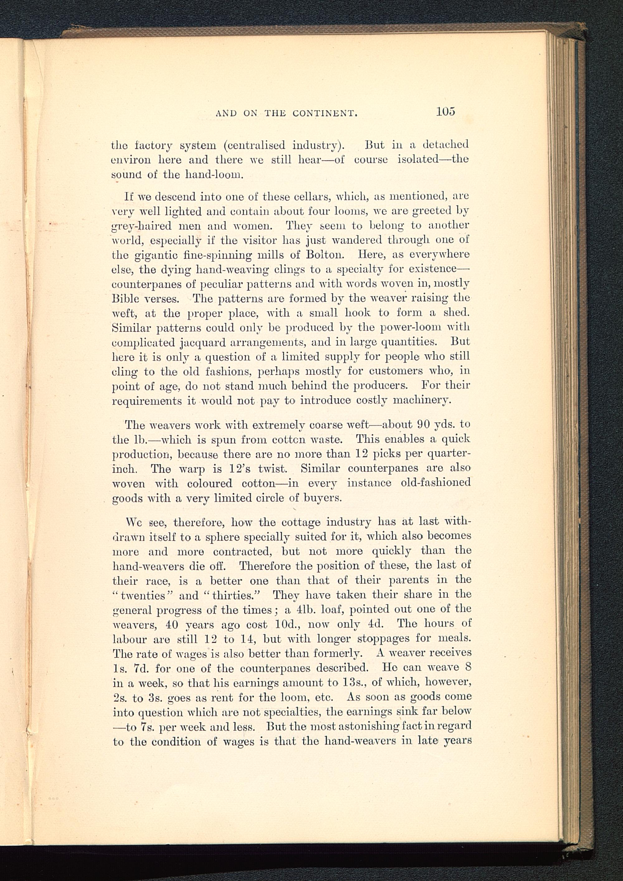 Wc see, therefore, how the cottage industry has at last with-drawn itself to a sphere specially suited for it, which also becomesmore and more contracted, but not more quickly than thehand-weavers die off. Therefore the position of these, the last oftheir race, is a better one than that of their parents in the“ twenties ” and “ thirties.” They have taken their share in thegeneral progress of the times; a 41b. loaf, pointed out one of theweavers, 40 years ago cost 10d., now only 4d. The hours oflabour are still 12 to 14, but with longer stoppages for meals.The rate of wages is also better than formerly. A weaver receivesIs. 7d. for one of the counterpanes described. Ho can weave 8in a w r eek, so that his earnings amount to 13s., of which, however,2s. to 3s. goes as rent for the loom, etc. As soon as goods comeinto question which are not specialties, the earnings sink far below—to 7s. per week and less. But the most astonishing fact in regardto the condition of wages is that the hand-weavers in late years