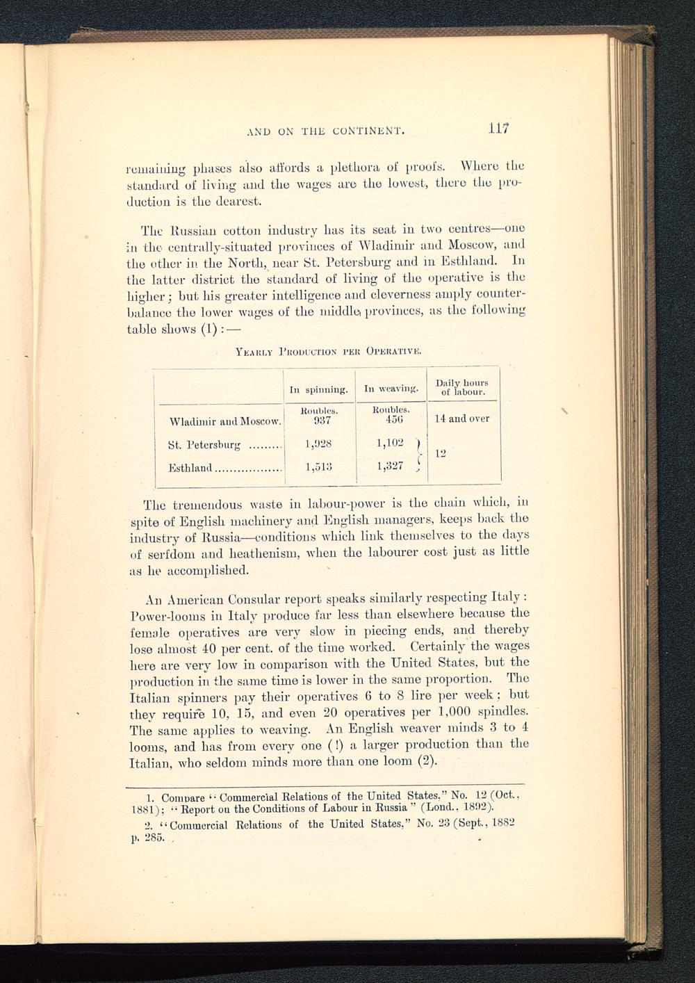 The Russian cotton industry has its seat in two centres—onein the centrally-situated provinces of Wladimir and Moscow , andthe other in the North, near St. Petersburg and m Esthland. Inthe latter district the standard of living of the operative is thehigher; but his greater intelligence and cleverness amply counter-balance tlm lower wages of the middle provinces, as the followingtable shows (1) : —
