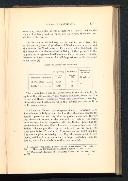 An American Consular report speaks similarly respecting Italy :Power-looms in Italy produce far less than elsewhere because thefemale operatives are very slow in piecing ends, and therebylose almost 40 per cent, of the time worked. Certainly the wageshere are very low in comparison with the United States , but theproduction in the same time is lower in the same proportion. TheItalian spinners pay their operatives 6 to 8 lire per week ; butthey require 10, 15, and even 20 operatives per 1,000 spindles.The same applies to weaving. An English weaver minds 3 to 4looms, and has from every one (!) a larger production than theItalian, who seldom minds more than one loom (2).