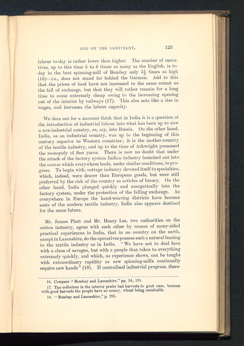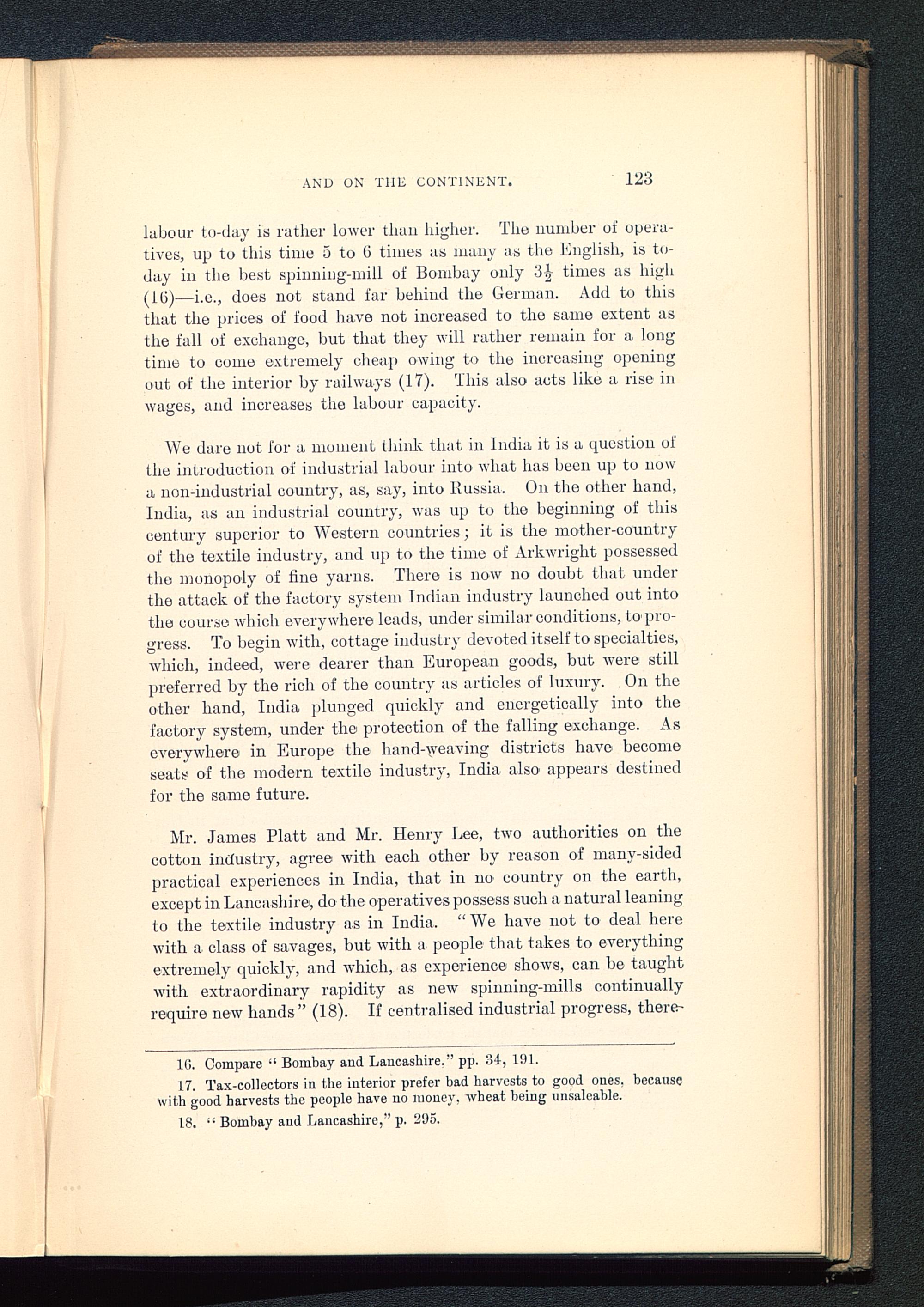 Mr. James Platt and Mr. Henry Lee, two authorities on thecotton industry, agree with each other by reason of many-sidedpractical experiences in India, that in no country on the earth,except in Lancashire , do the operatives possess such a natural leaningto the textile industry as in India. “We have not to deal herewith a class of savages, but with a people that takes to everythingextremely quickly, and which, as experience shows, can be taughtwith extraordinary rapidity as new spinning-mills continuallyrequire new hands” (18). If centralised industrial progress, there-