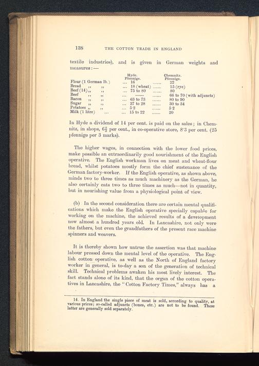 The higher wages, in connection with the lower food prices,make possible an extraordinarily good nourishment of the English operative. The English workman lives on meat and wheat-flourbread, whilst potatoes mostly form the chief sustenance of theGerman factory-worker. If the English operative, as shown above,minds two to three times as much machinery as the German , healso 1 certainly eats two to three times as much—not in quantity,but in nourishing value from a physiological point of view.