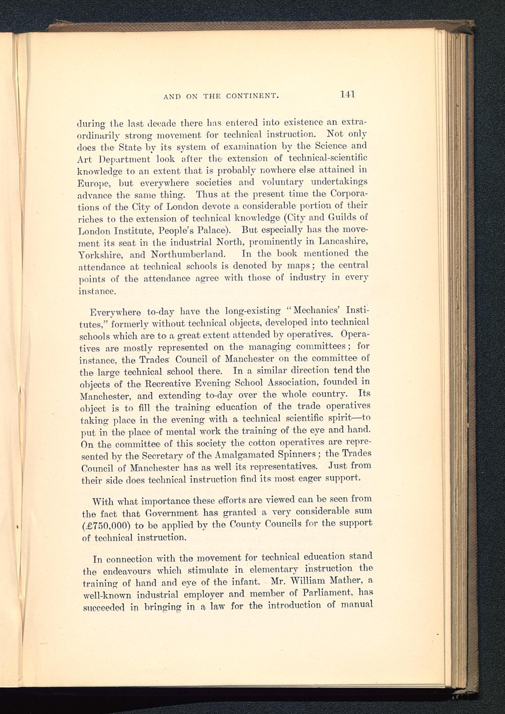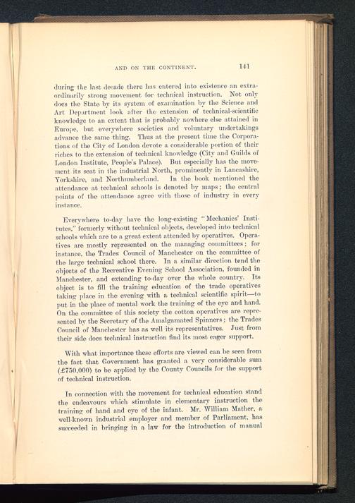 In connection with the movement for technical education standthe endeavours which stimulate in elementary instruction thetraining of hand and eye of the infant. Mr. William Mather, awell-known industrial employer and member of Parliament , hassucceeded in bringing in a law for the introduction of manual