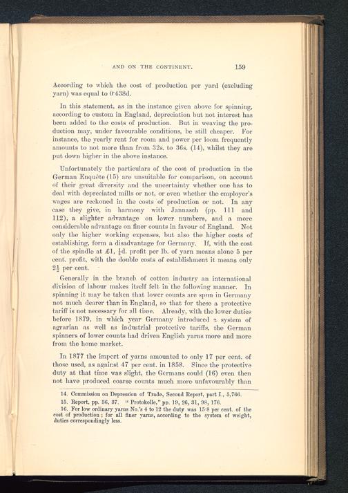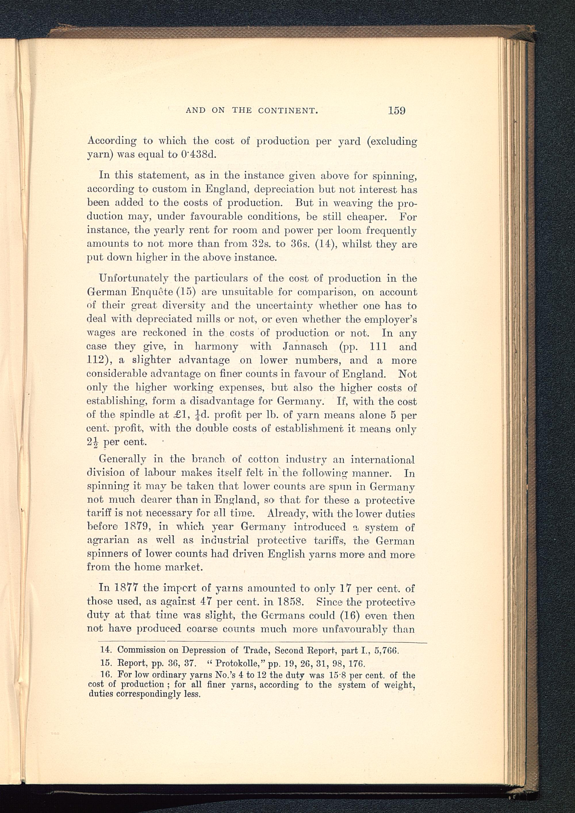 16. For low ordinary yarns No.’s 4 to 12 the duty was 15 8 per cent, of thecost of production ; for all finer yarns, according to the system of weight,duties correspondingly less.