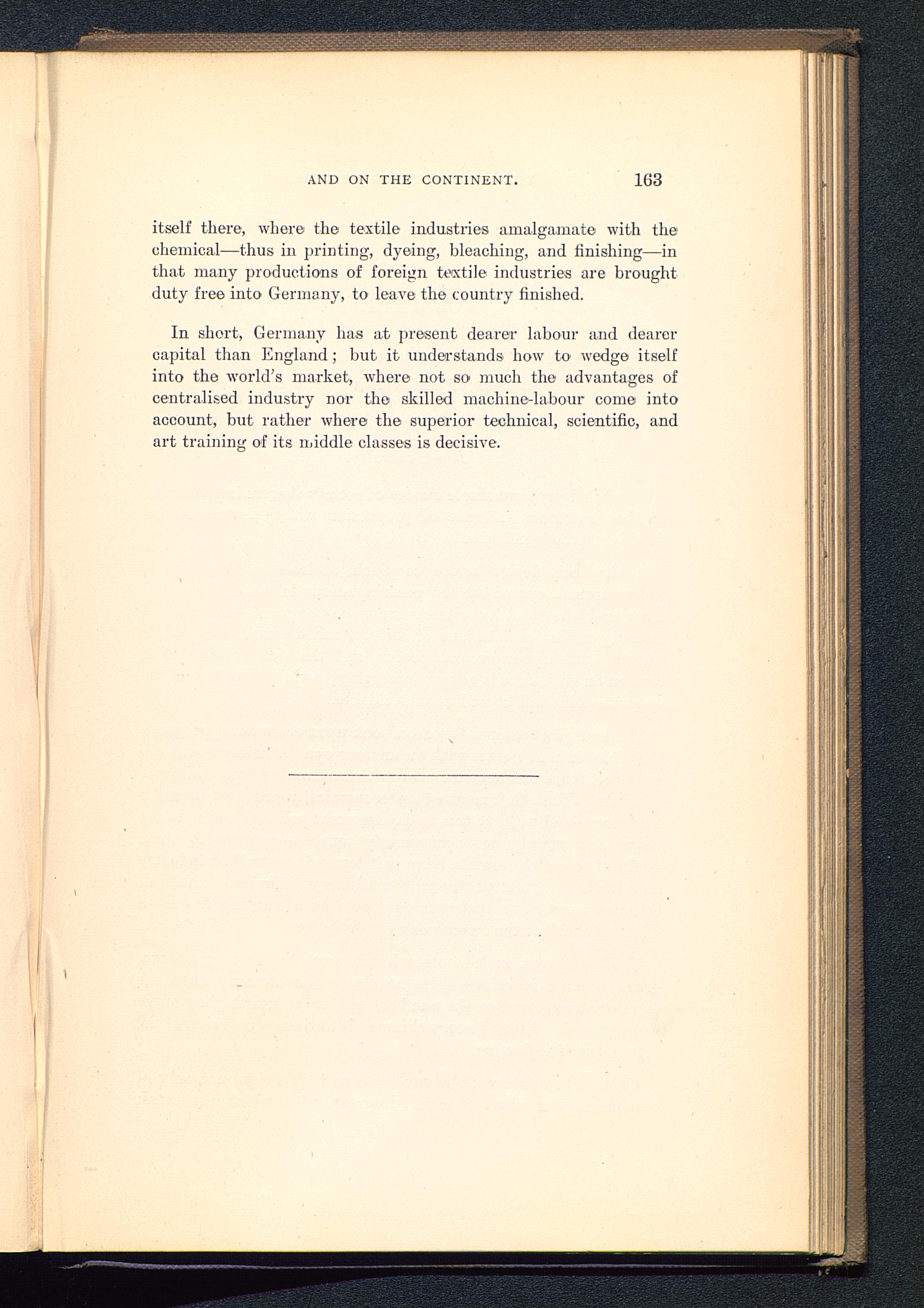 itself there, where the textile industries amalgamate with thechemical—thus in printing, dyeing, bleaching, and finishing—inthat many productions of foreign textile industries are broughtduty free into Germany , to leave the country finished.