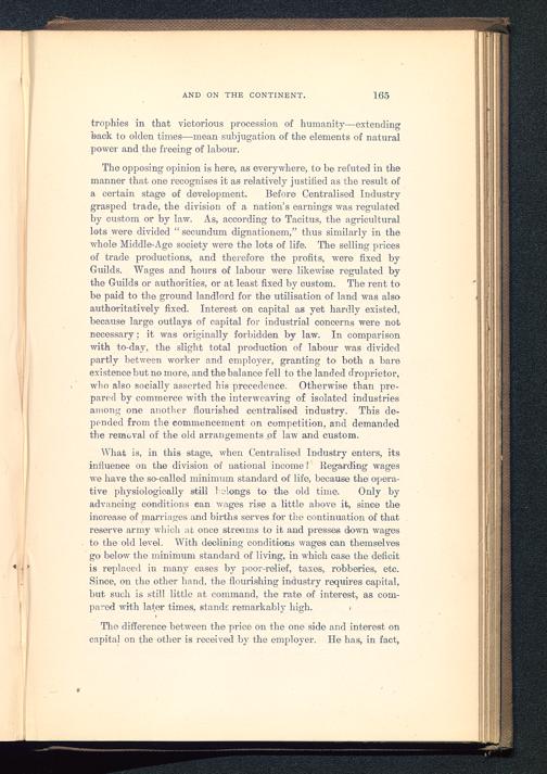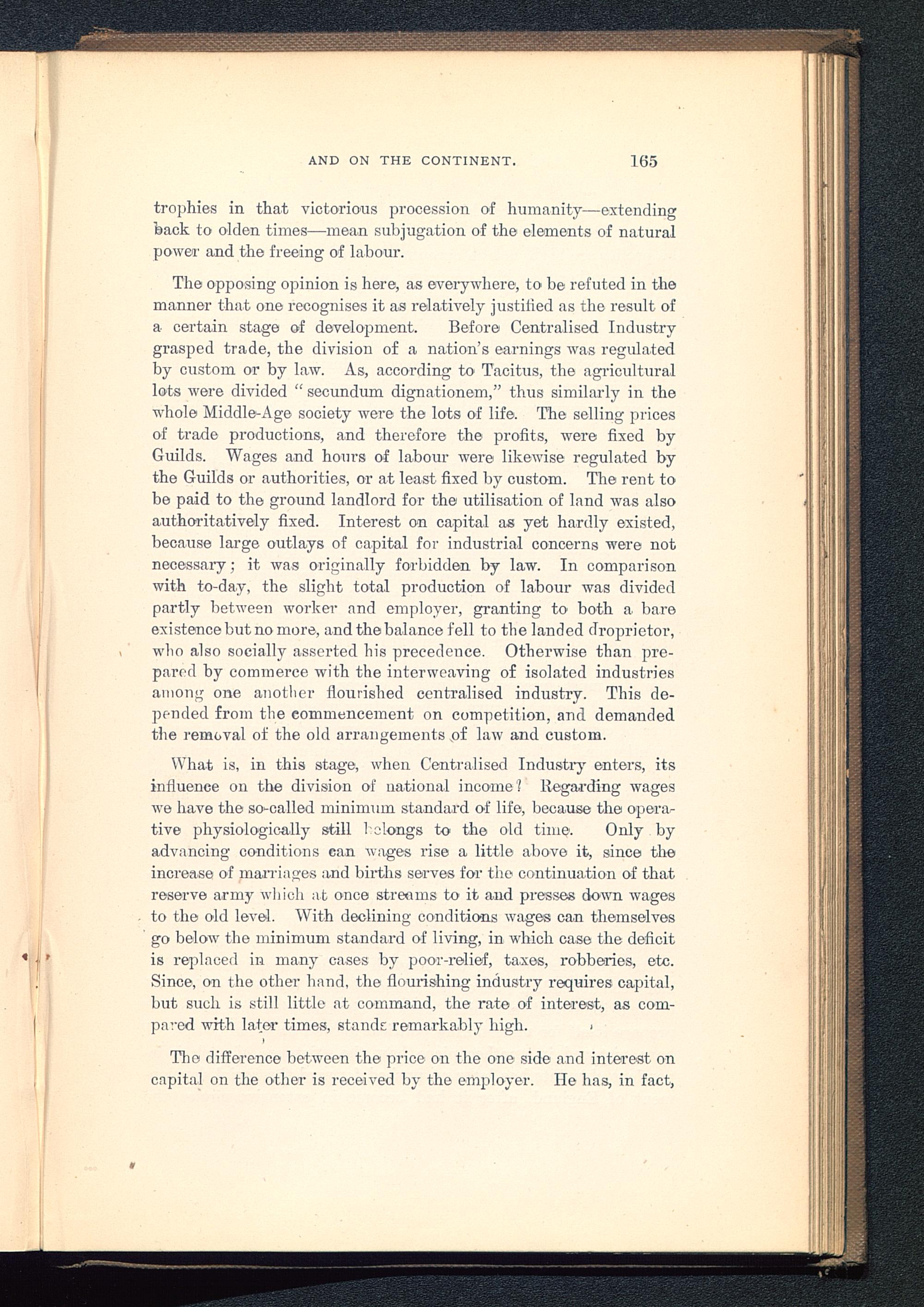 The opposing opinion is here, as everywhere, to be refuted in themanner that one recognises it as relatively justified as the result ofa- certain stage of development. Before Centralised Industrygrasped trade, the division of a nation’s earnings was regulatedby custom or by law. As, according to Tacitus , the agriculturallots were divided “ secundum dignationem,” thus similarly in thewhole Middle-Age society were the lots of life. The selling pricesof trade productions, and therefore the profits, were fixed byGuilds . Wages and hours of labour were likewise regulated bythe Guilds or authorities, or at least fixed by custom. The rent tobe paid to the ground landlord for the utilisation of land was alsoauthoritatively fixed. Interest on capital as yet hardly existed,because large outlays of capital for industrial concerns were notnecessary; it was originally forbidden by law. In comparisonwith to-day, the slight total production of labour was dividedpartly between worker and employer, granting to both a bareexistence but no more, and the balance fell to the landed droprietor,who also socially asserted his precedence. Otherwise than pre-pared by commerce with the interweaving of isolated industriesamong one another flourished centralised industry. This de-pended from the commencement on competition, and demandedthe removal of the old arrangements .of law and custom.