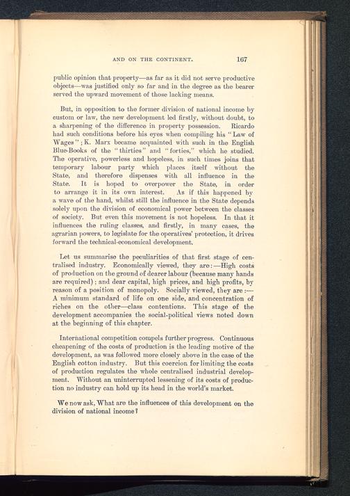 Let us summarise the peculiarities of that first stage of cen-tralised industry. Economically viewed, they are:—High costsof production on the ground of dearer labour (because many handsare required); and dear capital, high prices, and high profits, byreason of a position of monopoly. Socially viewed, they are :—A minimum standard of life on one side, and concentration ofriches on the other—class contentions. This stage of thedevelopment accompanies the social-political views noted downat the beginning of this chapter.