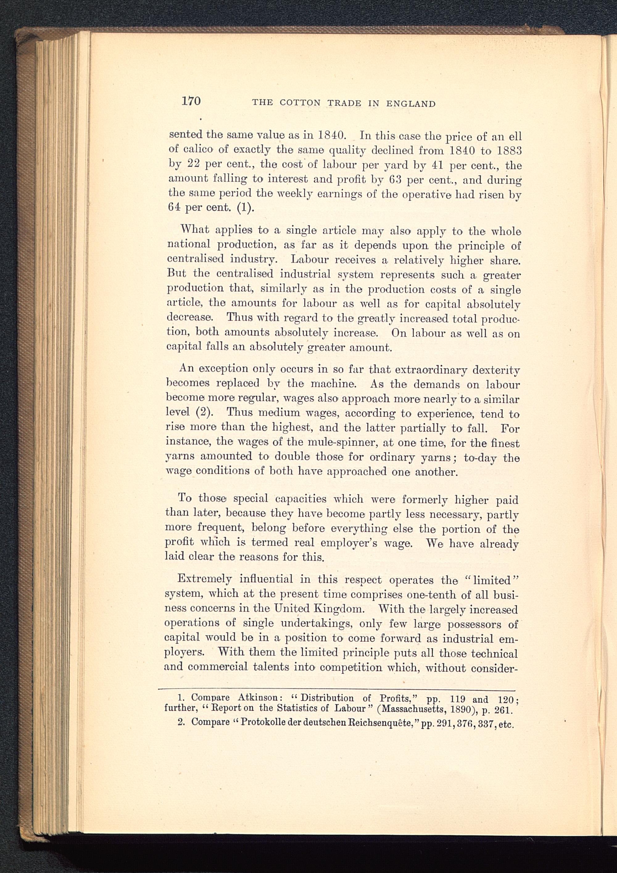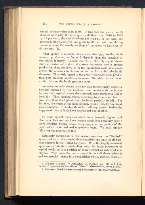 An exception only occurs in so far that extraordinary dexteritybecomes replaced by the machine. As the demands on labourbecome more regular, wages also approach more nearly to a similarlevel (2). Thus medium wages, according to experience, tend torise more than the highest, and the latter partially to fall. Forinstance, the wages of the mule-spinner, at one time, for the finestyarns amounted to double those for ordinary yarns; to'-day thewage conditions of both have approached one another.